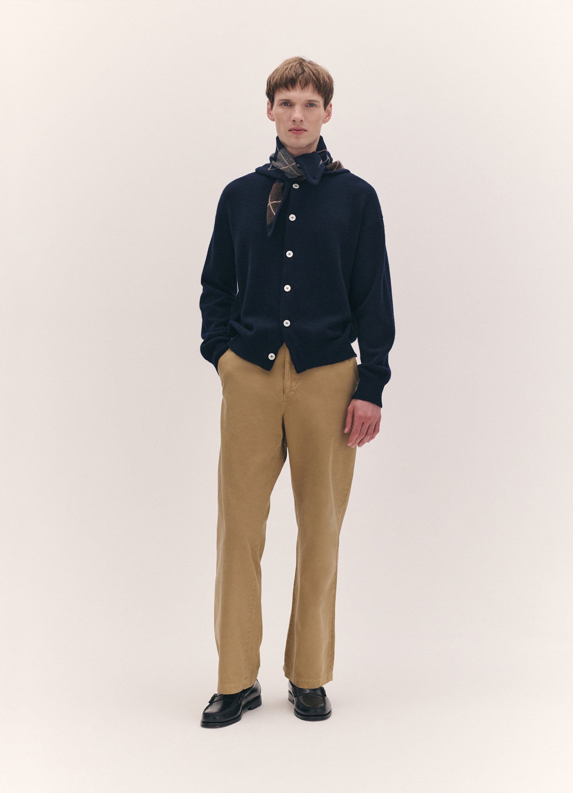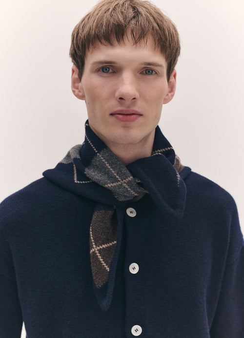 Oleks is wearing the Argyle Cashmere Foulard in Navy and Brown styled with the Ada Crewneck Cardigan in Navy.
