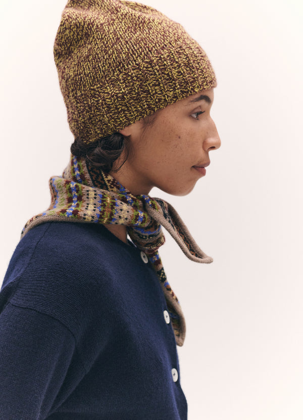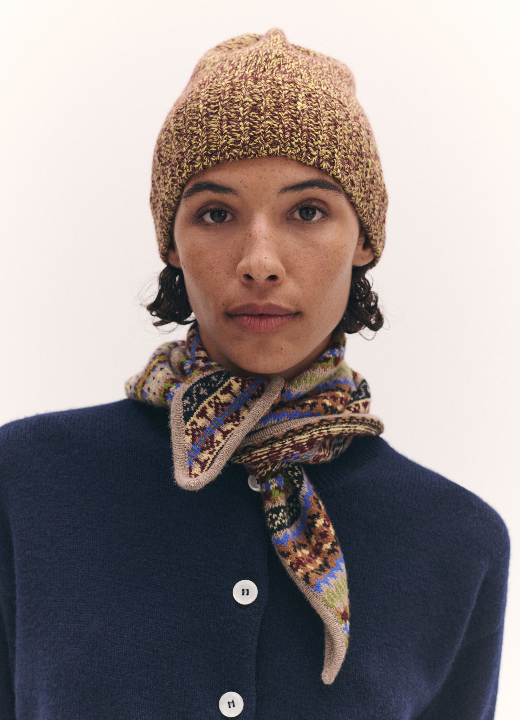 Maya wears the Rib Trim Cashmere Hat in Port and Punch Mouline styled with the Ada Crewneck Cardigan in Navy and the Fairisle Cashmere Foulard in Dark Natural Multi.