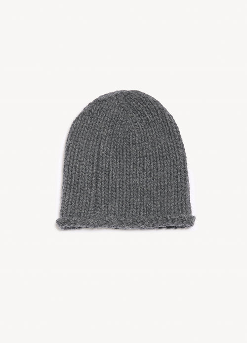 The Ribbed Cashmere Beanie in Derby Grey is made from a super soft chunky cashmere yarn, offering unparalleled softness and warmth. Featuring a ribbed texture and a rolled edge cuff.