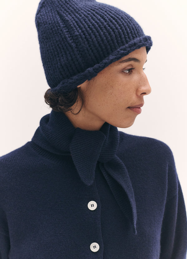Maya wears the Ribbed Cashmere Beanie in Navy styled with the Ada Crewneck Cardigan in Navy and the Fionn Cashmere Foulard in Navy.