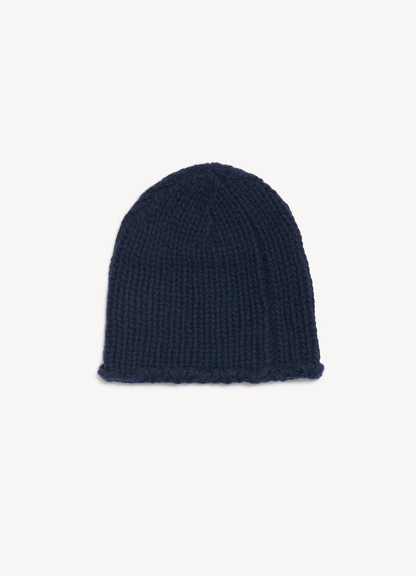 The Ribbed Cashmere Beanie in Navy is made from a super soft chunky cashmere yarn, offering unparalleled softness and warmth. Featuring a ribbed texture and a rolled edge cuff.