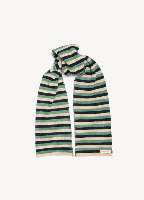 The Striped Cashmere Scarf in Strath, Navy and Oatmeal Stripe. A classic style made from super soft geelong lambswool, featuring ribbed detailing throughout. The perfect winter accessory.