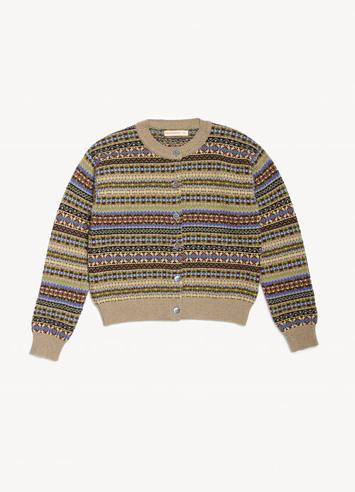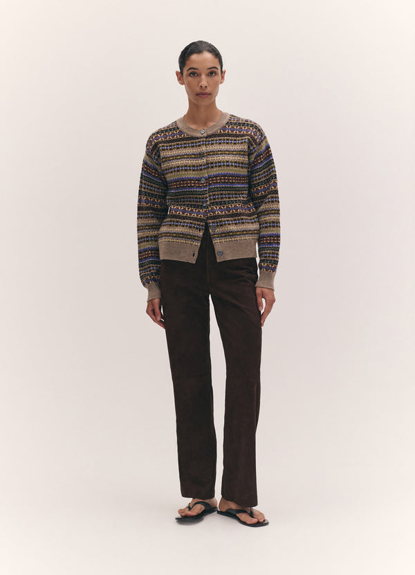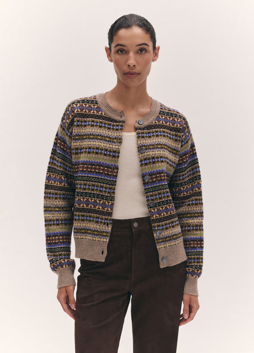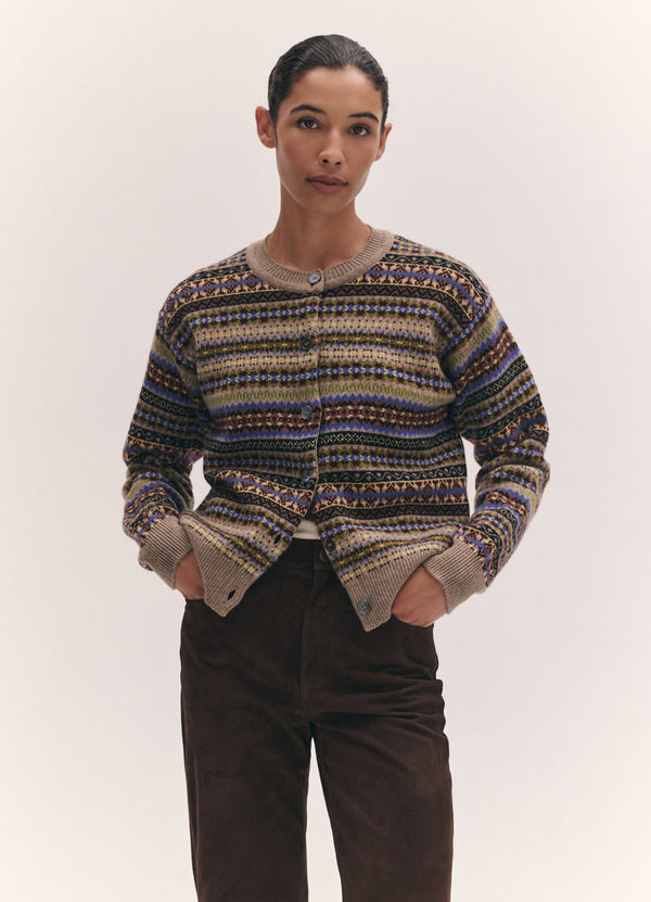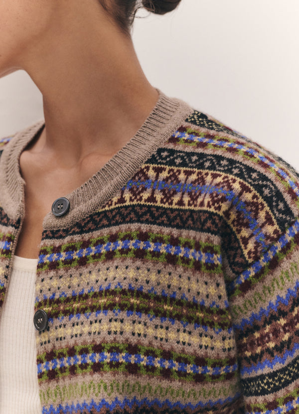 In softest, Scottish-spun Geelong lambswool, the Ada cardigan is inspired by the old school classicism of a crewneck cardigan but with a gently modern sensibility. Proportions are softened and subtly slouchy to create a relaxed silhouette. A heritage Fairisle with a dark natural base and multicolour pattern. Finished with responsibly sourced trocas shell buttons.