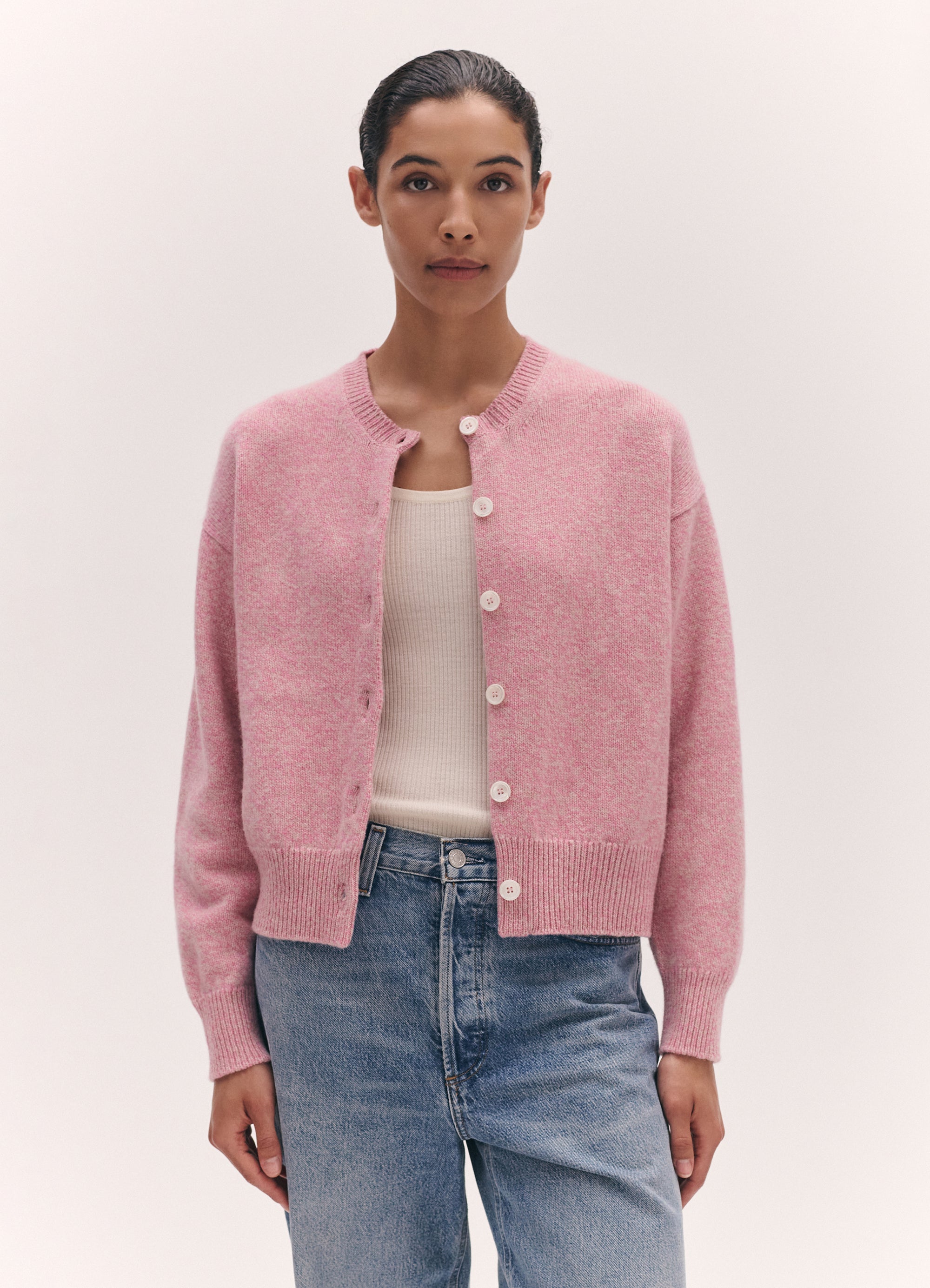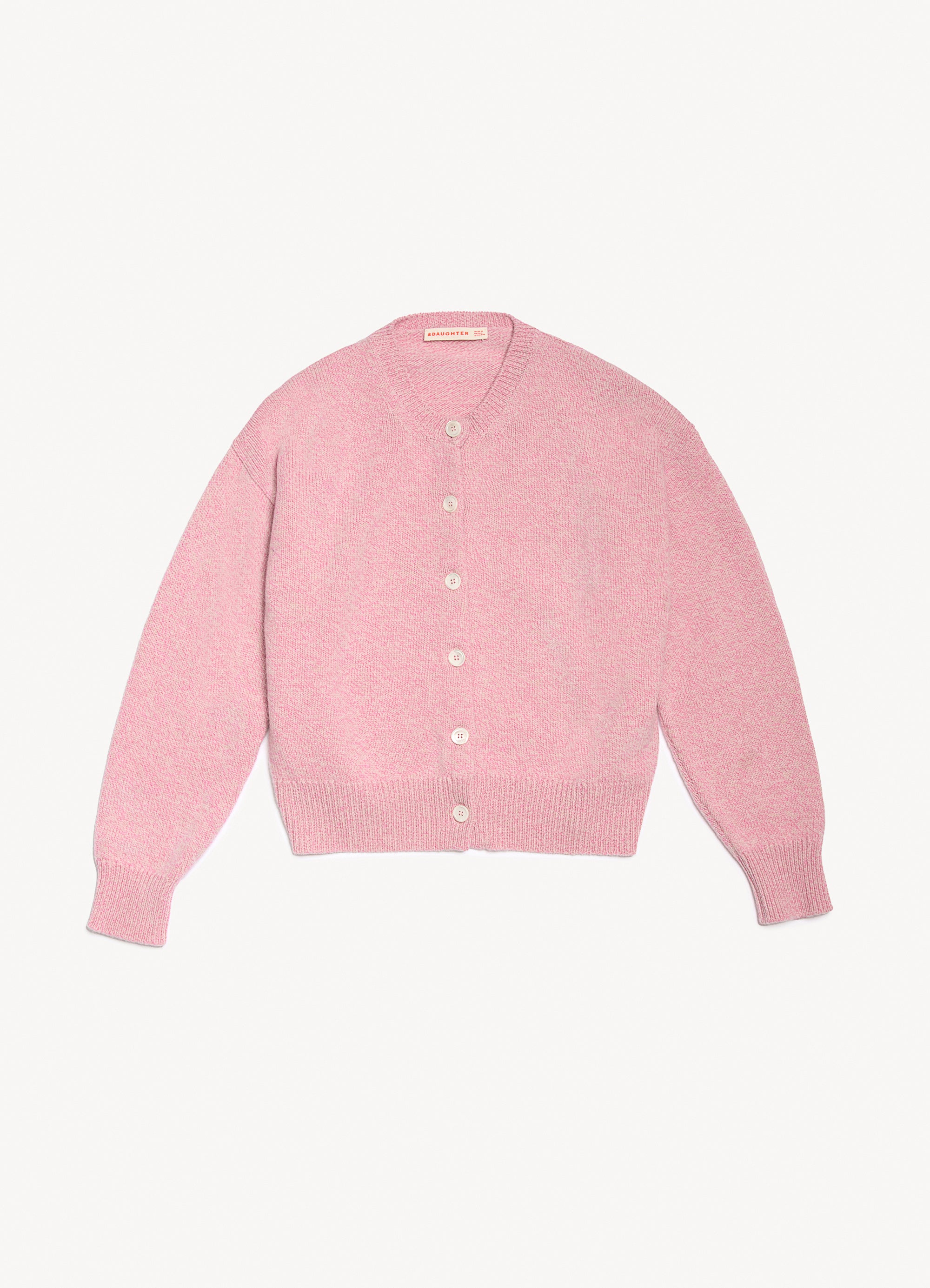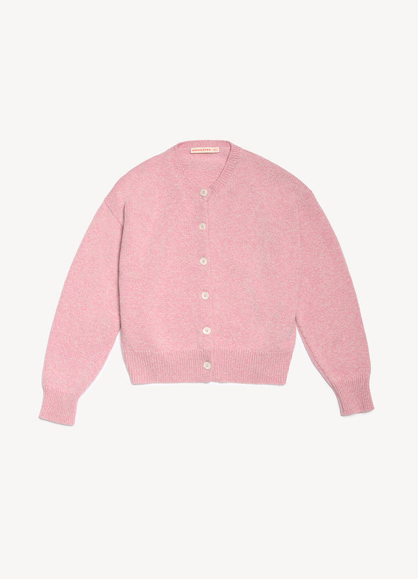 The Ada Crewneck Cardigan in softest, Scottish-spun Mouline geelong lambswool. Inspired by the old school classicism of a crewneck cardigan but with a gently modern sensibility, proportions are softened and subtly slouchy to create a relaxed silhouette. New this season in Mouline yarn. Mouline is a twisted yarn made up, in this style, of three shades, bright pink, pale pink & oatmeal, creating a soft speckled appearance.