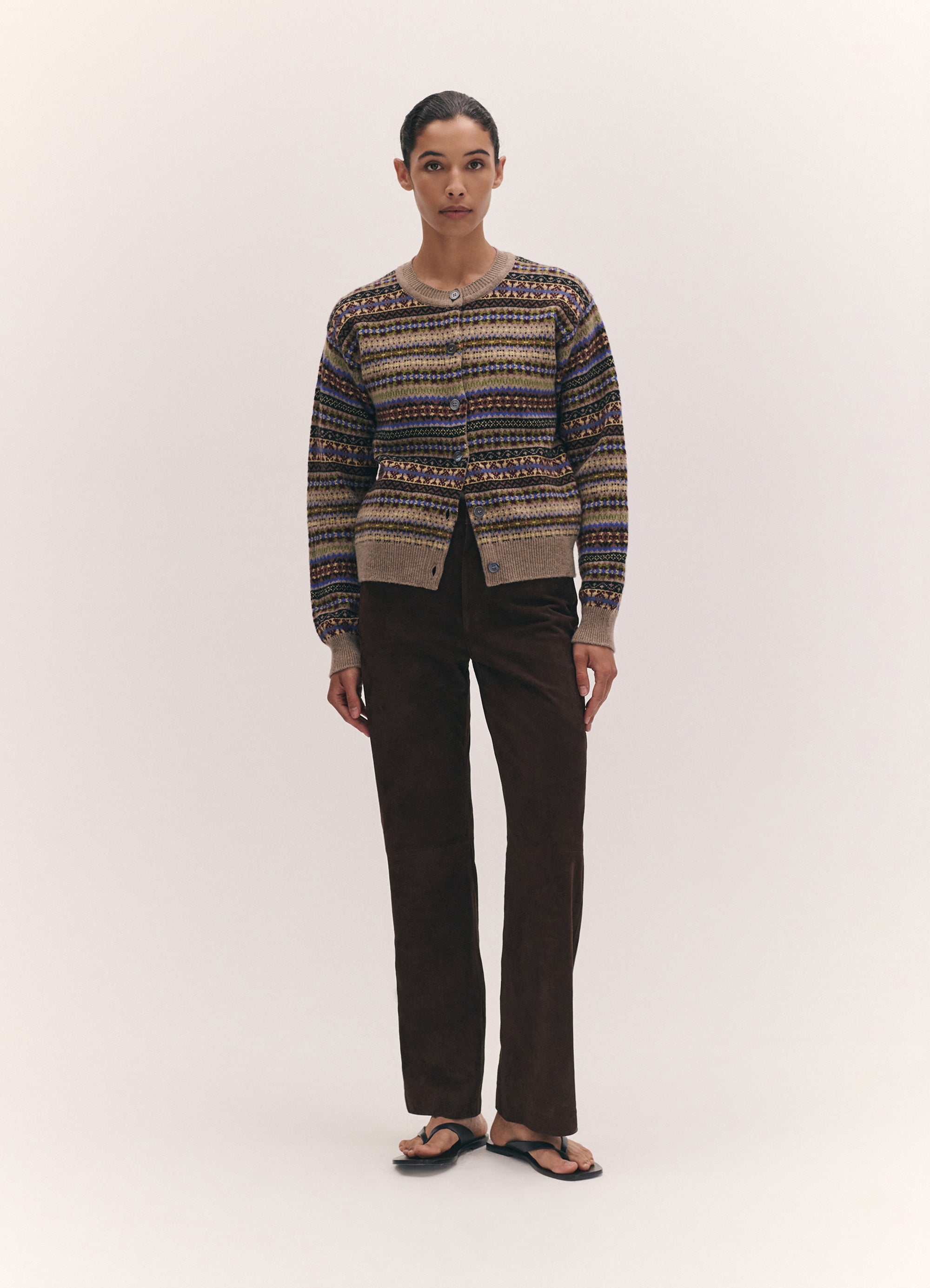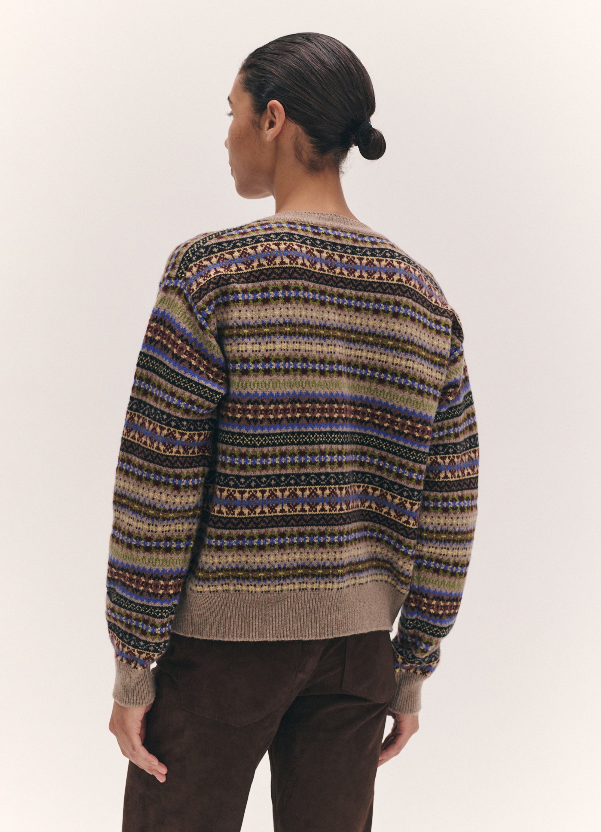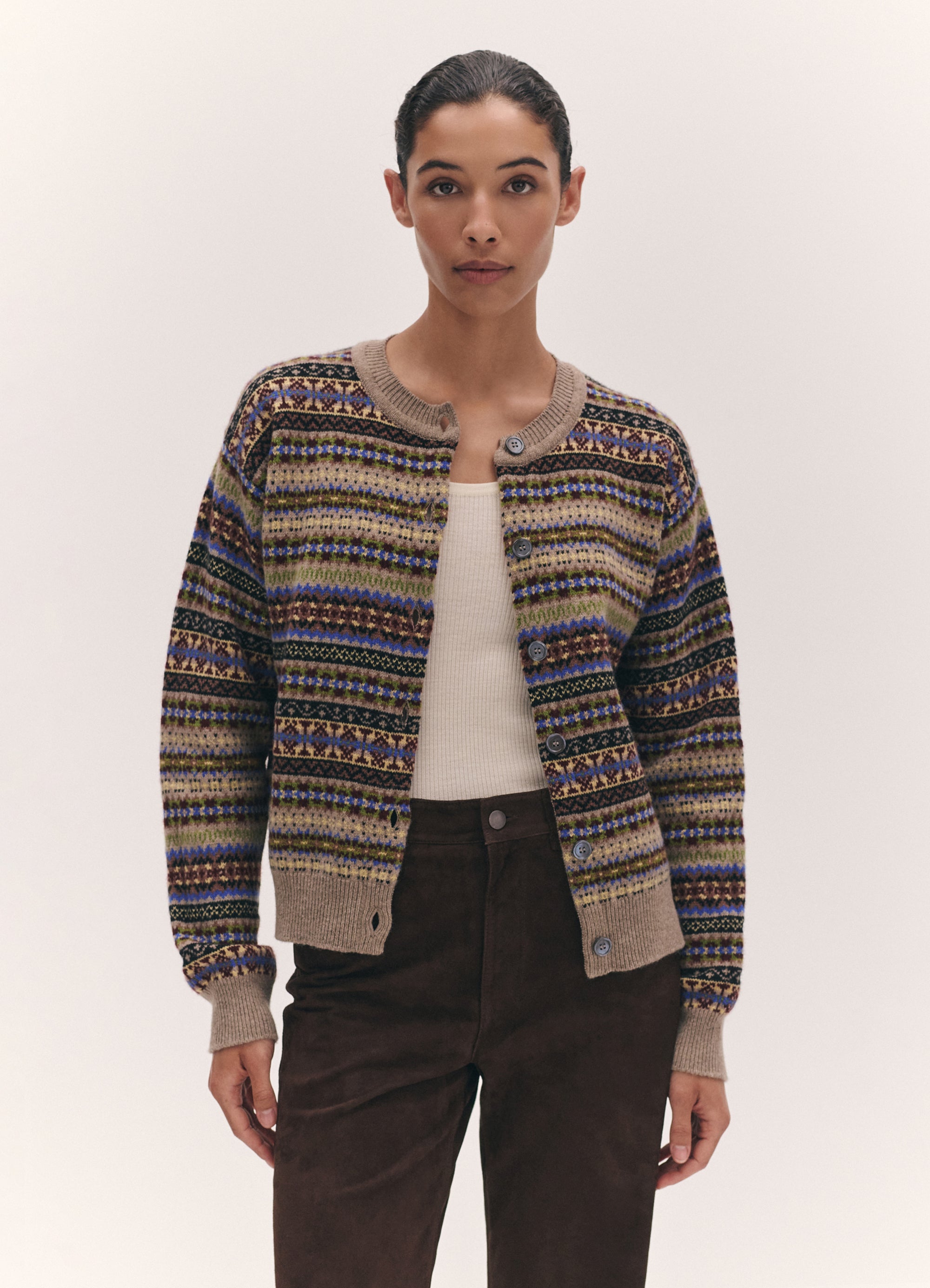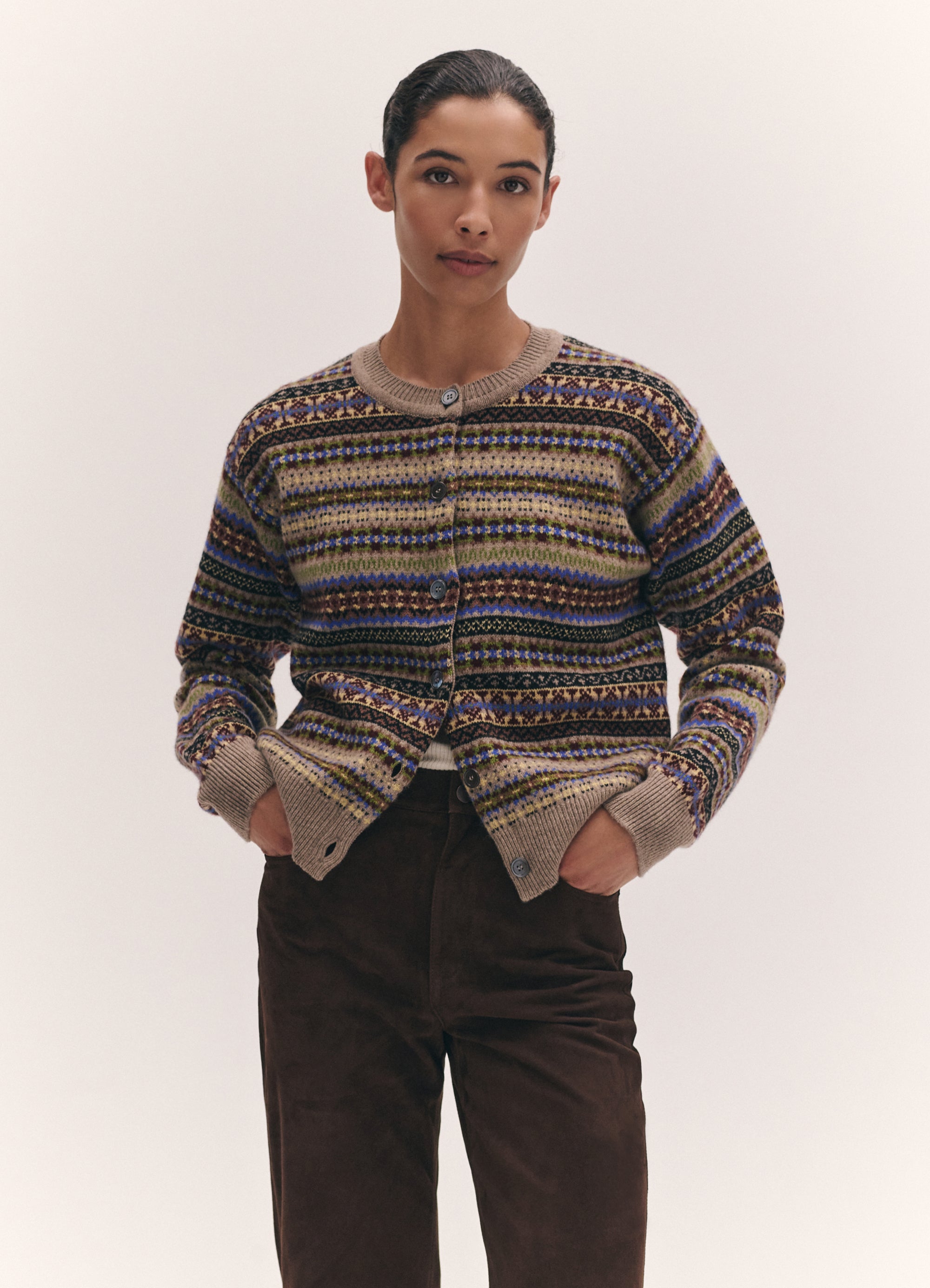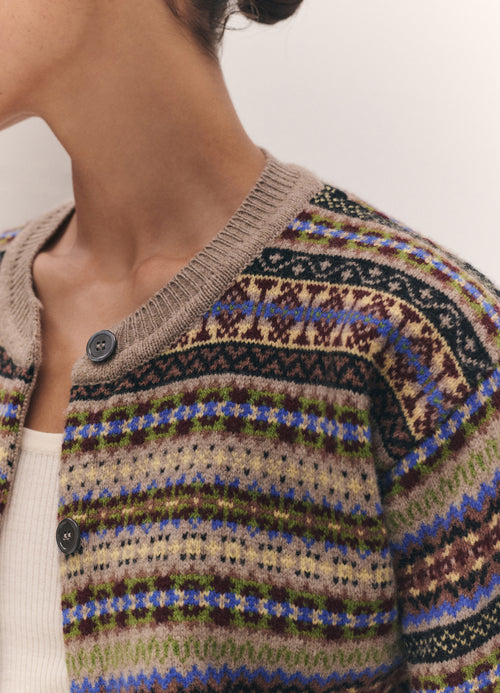 In softest, Scottish-spun Geelong lambswool, the Ada cardigan is inspired by the old school classicism of a crewneck cardigan but with a gently modern sensibility. Proportions are softened and subtly slouchy to create a relaxed silhouette. A heritage Fairisle with a dark natural base and multicolour pattern. Finished with responsibly sourced trocus shell buttons.