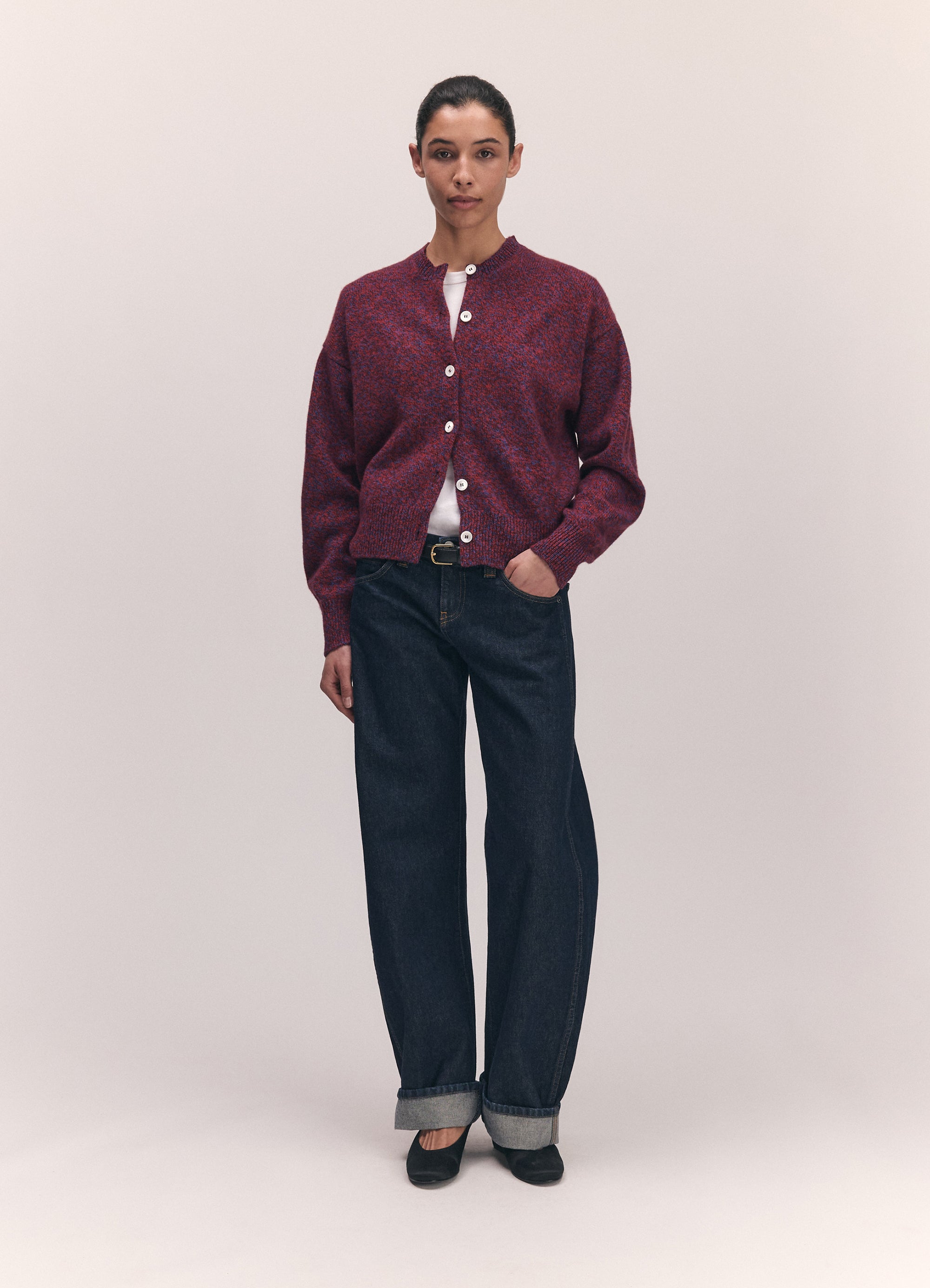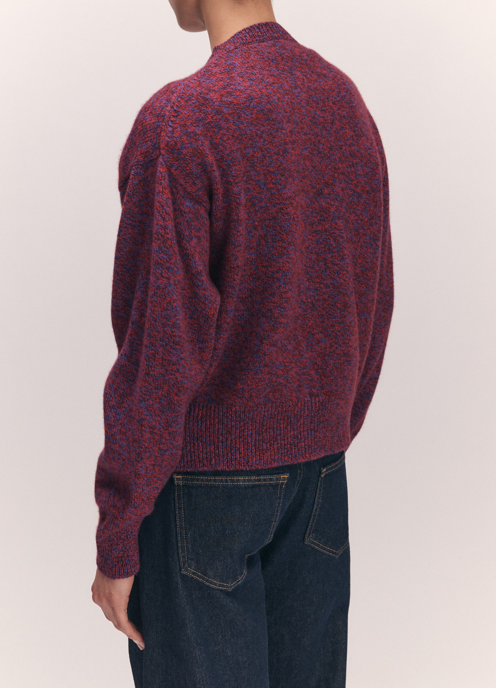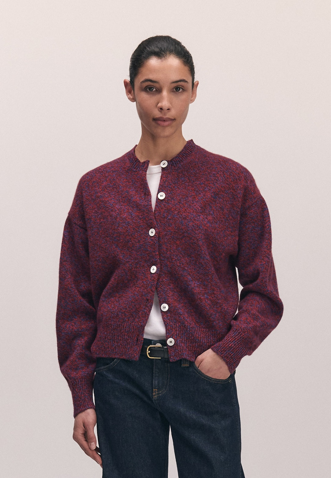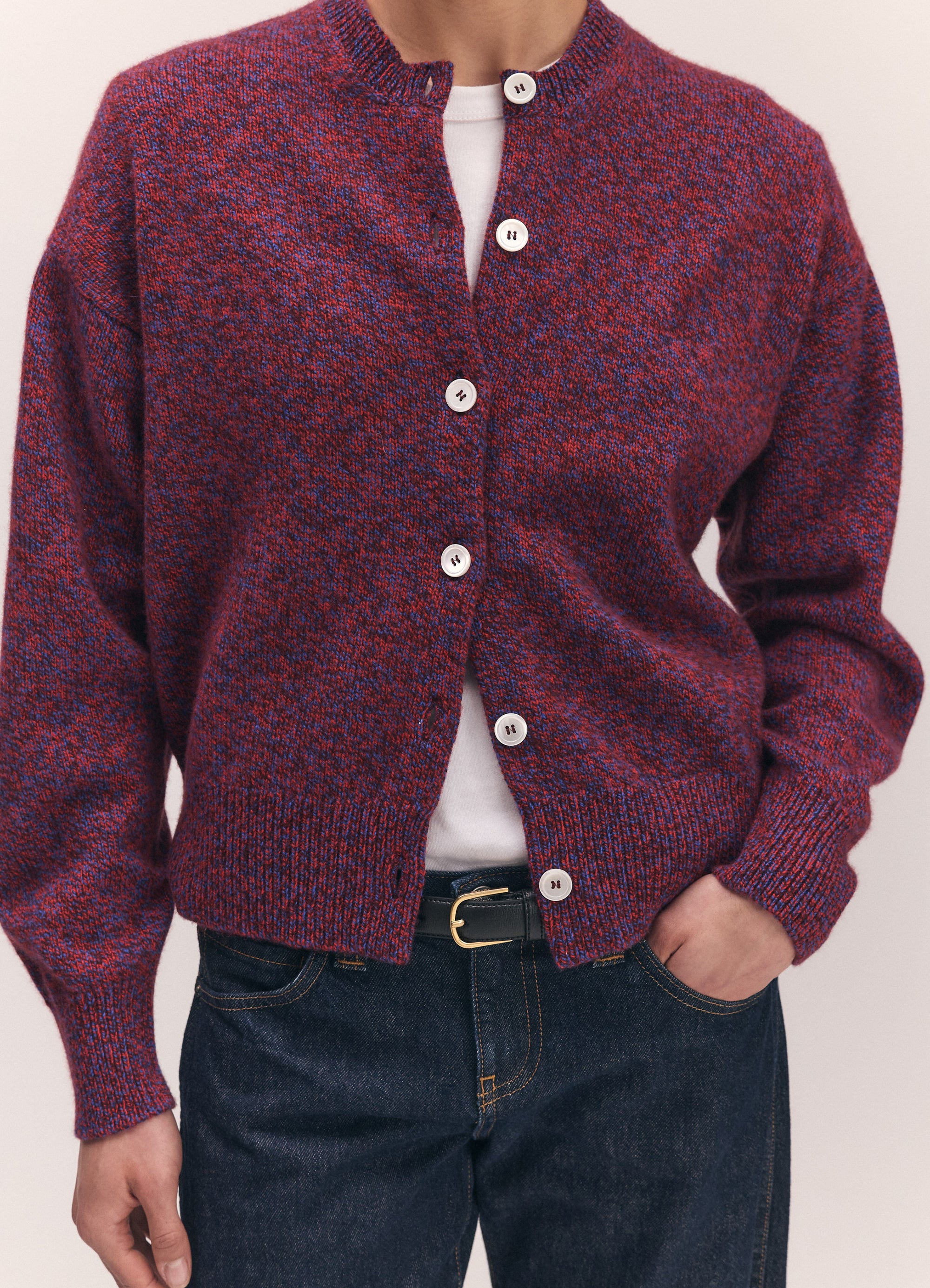 The Ada Mouline Crewneck Cardigan in softest, Scottish-spun Mouline geelong lambswool. Inspired by the old school classicism of a crewneck cardigan but with a gently modern sensibility, proportions are softened and subtly slouchy to create a relaxed silhouette. Mouline is a slightly heavier twisted yarn made up, in this style, of three shades, poppy red, port and klein blue, creating a soft speckled appearance.