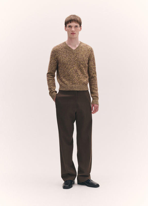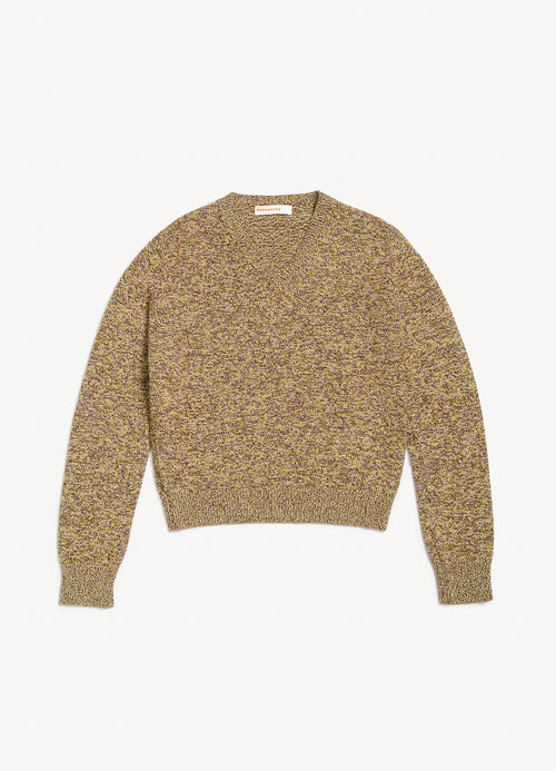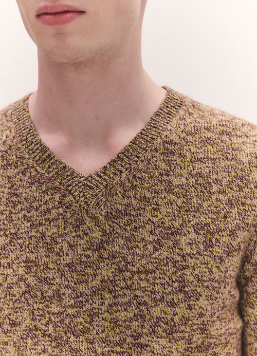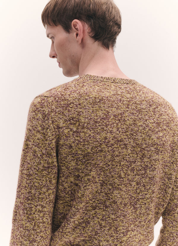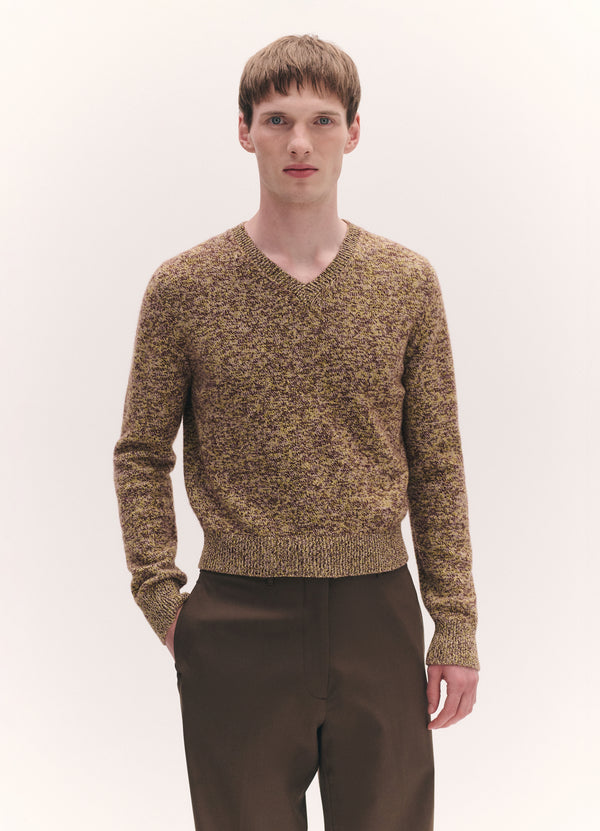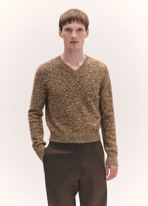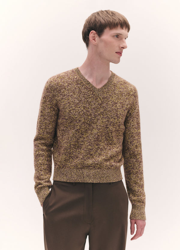 Introducing the new Sligo V-Neck in 7-ply Geelong wool using Mouline yarn. Mouline yarn is a twisted yarn made up, in this style, of three shades, lime green, pale pink & burgundy, creating a speckled appearance. The Sligo V is a modern knit shrunken v-neck, perfect for styling between seasons. This style has a neat, slightly shrunken fit, sitting just above the hips and features a ribbed crewneck, hem and cuffs.