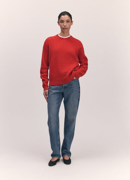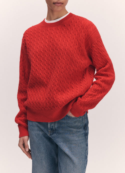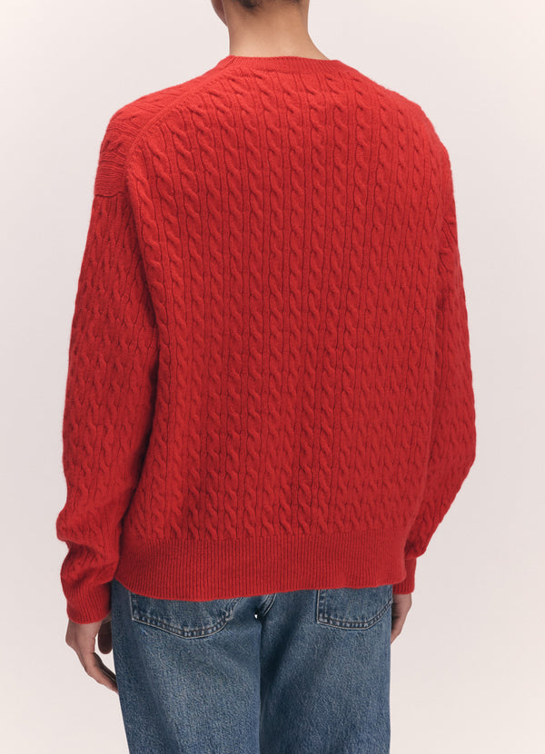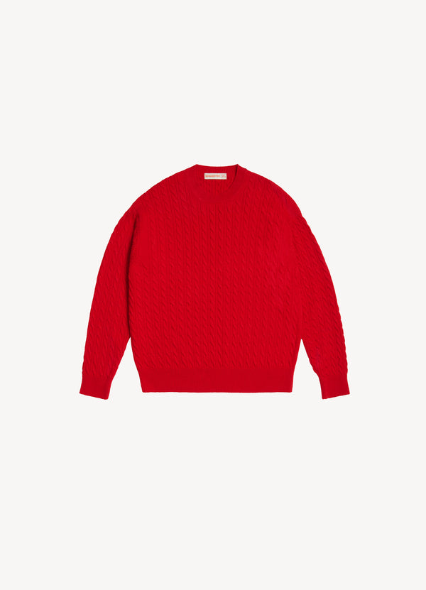 Knitted in a mid-weight 7-gauge cable stitch, the silhouette is softly structured with a relaxed, easy fit designed for everyday wear. Finished with ribbed trims and a clean crew neckline, it’s a versatile piece that works equally well layered or worn on its own.