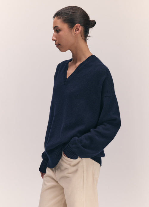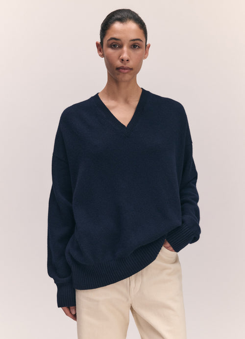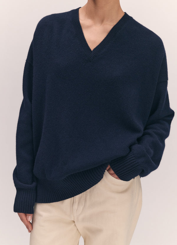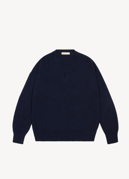 Knitted in a mid-weight 7-gauge lambswool, the silhouette is gently oversized with a slouchy, easy drape designed for everyday wear. Finished with a clean V-neckline and ribbed trims, it’s a versatile piece that layers effortlessly or stands alone.