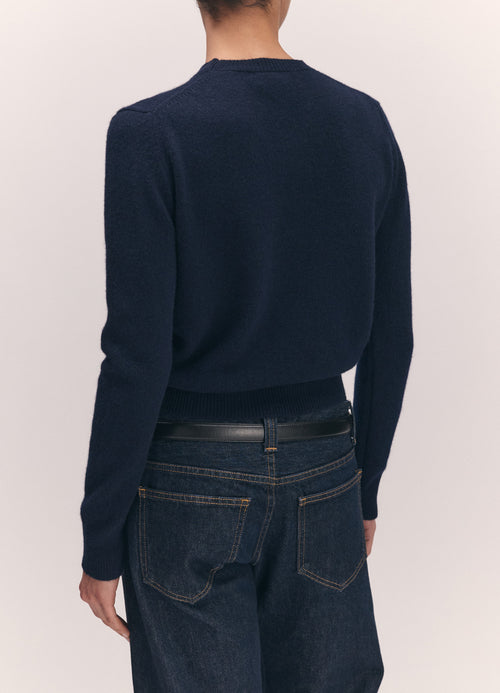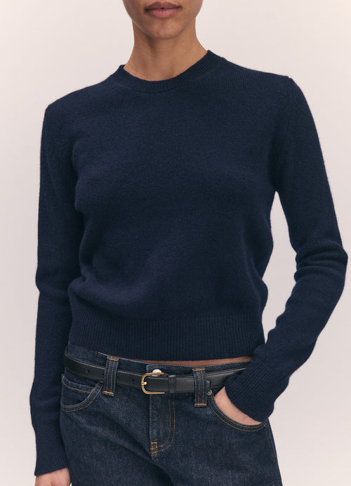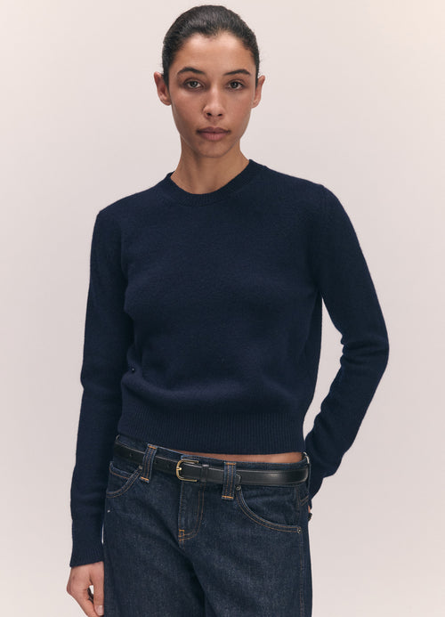 Introducing the new Sligo Crewneck in 7-ply Geelong wool. A modern knit shrunken crew, perfect for styling between seasons. This style has a neat, slightly shrunken fit, sitting just above the hips and features a ribbed crewneck, hem and cuffs.
