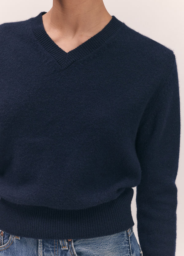 Introducing the new Sligo V-Neck in 7-ply Geelong wool. A modern knit shrunken v-neck, perfect for styling between seasons. This style has a neat, slightly shrunken fit, sitting just above the hips and features a ribbed crewneck, hem and cuffs.