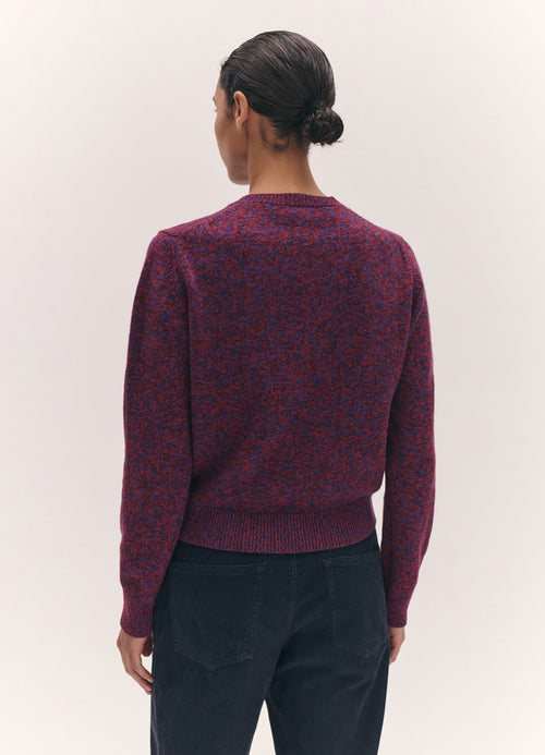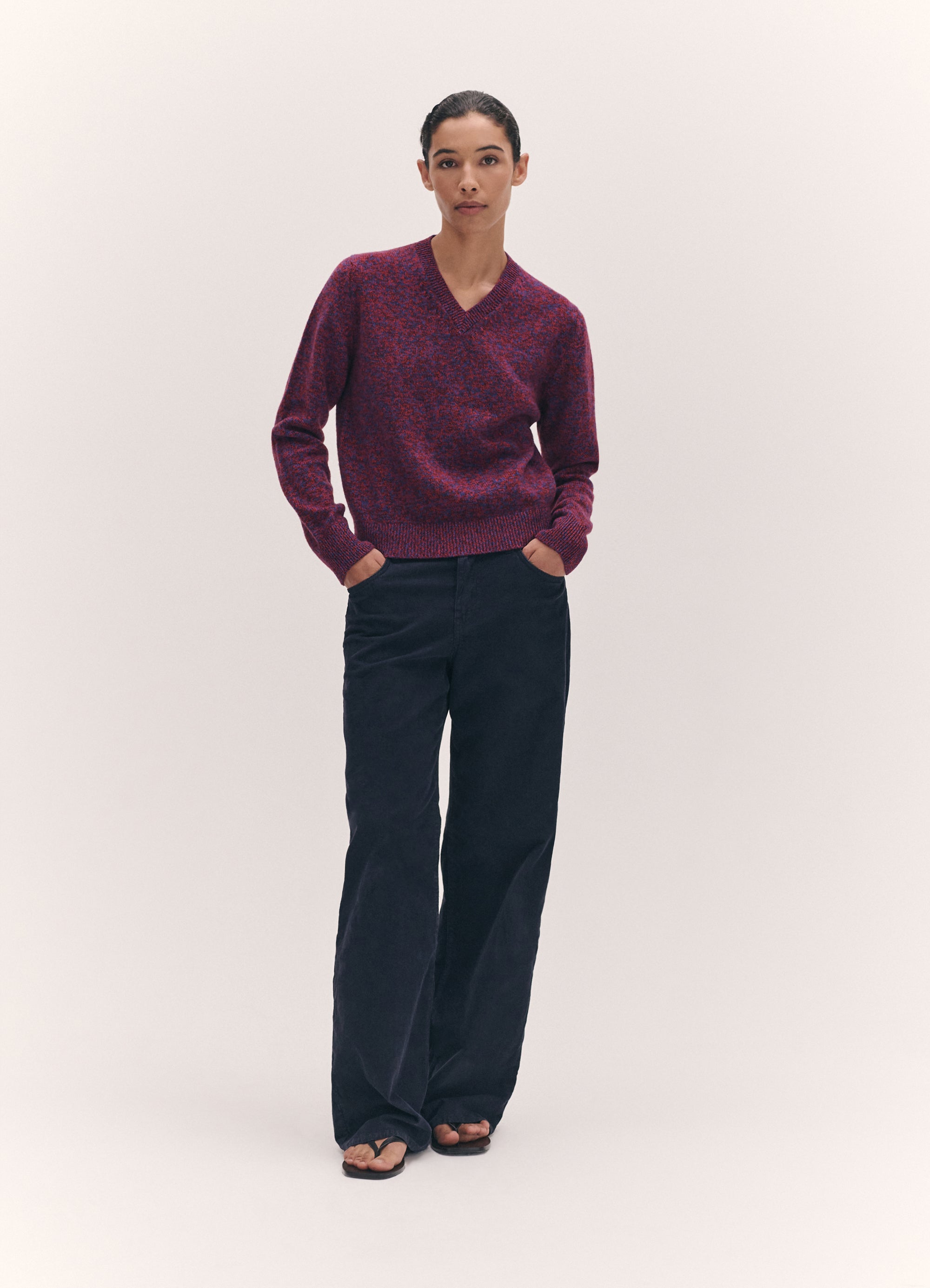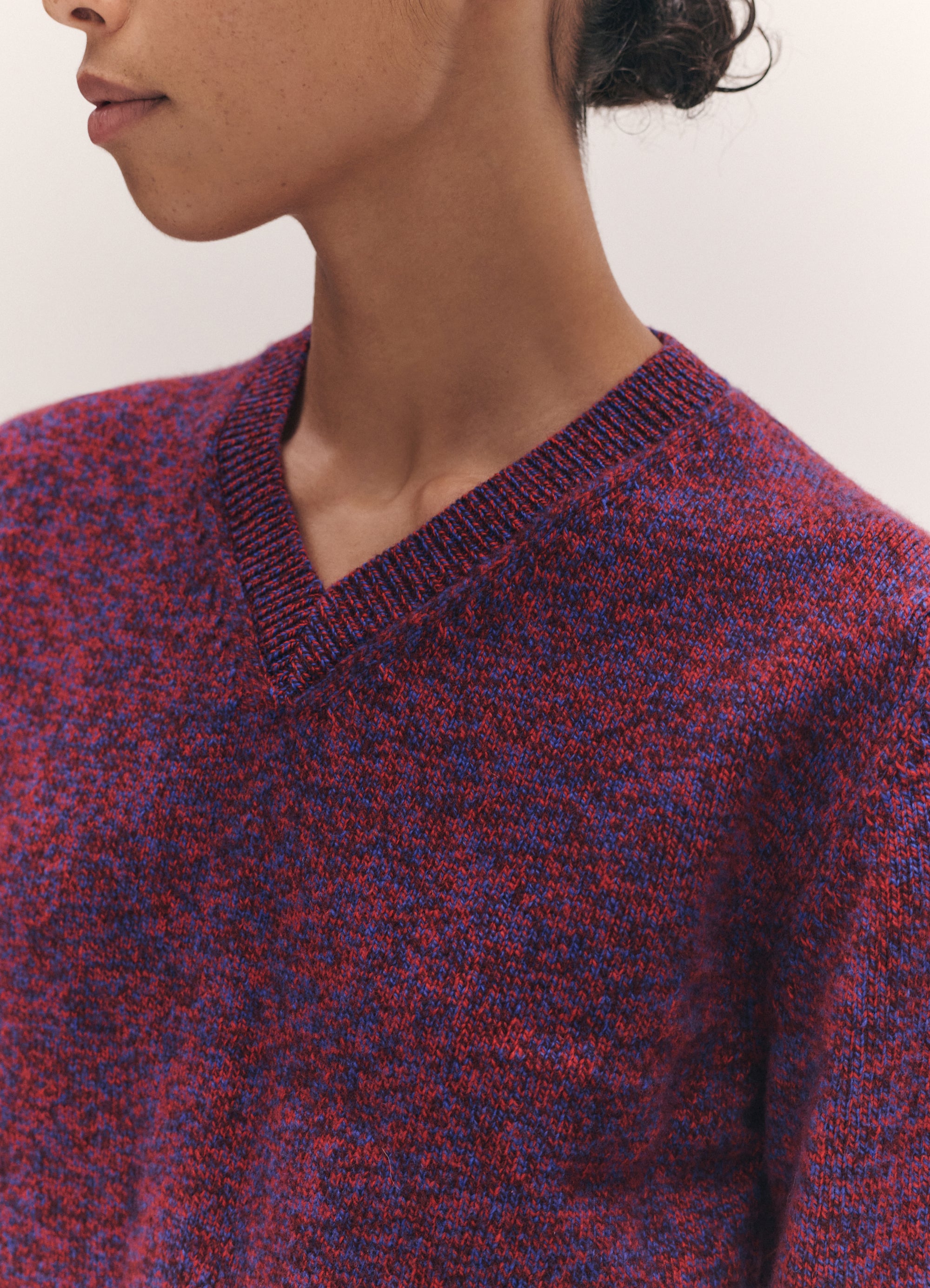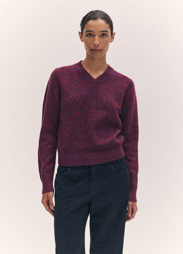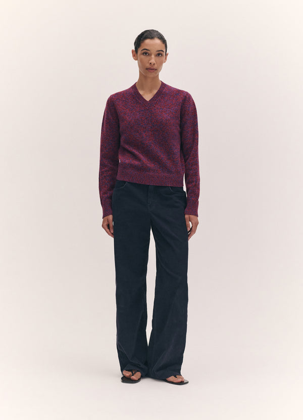 Introducing the new Sligo V-Neck in 7-ply Geelong wool using Mouline yarn. Mouline yarn is a twisted yarn made up, in this style, of three shades, poppy red, burgundy & klein blue, creating a speckled appearance. The Sligo V is a modern knit shrunken v-neck, perfect for styling between seasons. This style has a neat, slightly shrunken fit, sitting just above the hips and features a ribbed crewneck, hem and cuffs.
