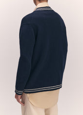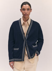 Clodagh V-Neck Cardigan in Navy with White Stripe Trim