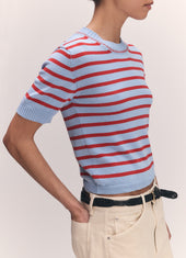 Rosha Shrunken Crewneck in Ruby Red and Dust Blue Stripe