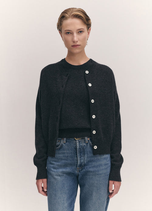 Mees is wearing the Ada Crewneck Cardigan in Charcoal styled with the Wicklow T-Shirt in Charcoal.
