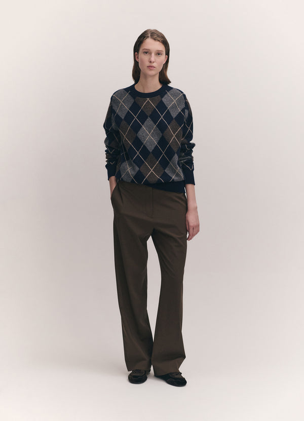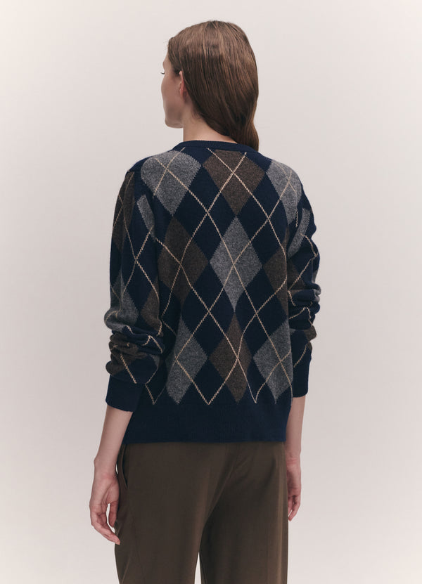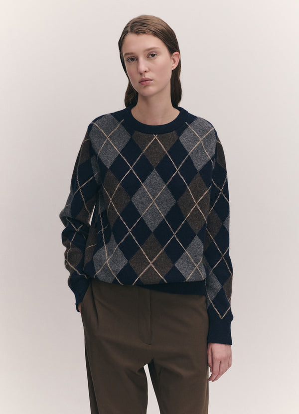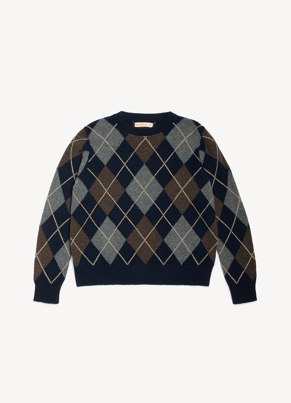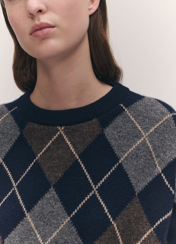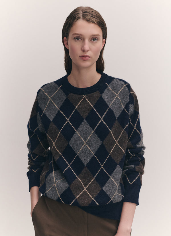 The Ava Argyle Crewneck in Navy with Brown is knit in a super soft, Scottish-spun Geelong lambswool. Its silhouette has a subtle slouch for ease of layering throughout the cooler months and an elegant drape.