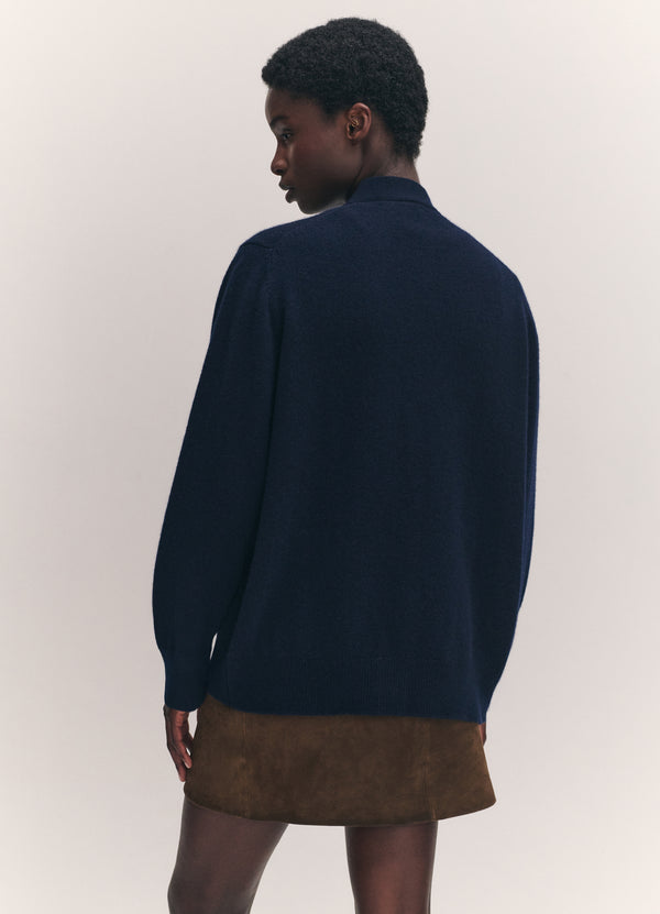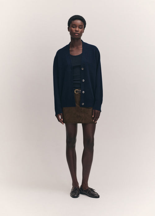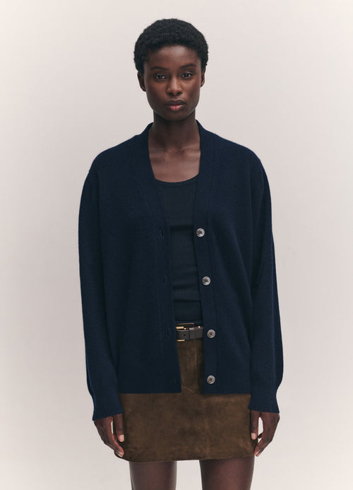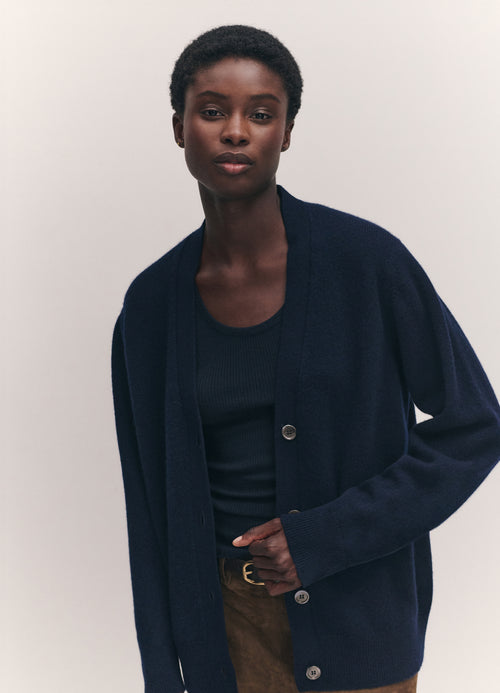 Introducing the Ava Cardigan in Navy, knit in super soft, Scottish-spun Geelong lambswool. Its silhouette is neither slim, nor oversized, and has a subtle slouch for ease of layering with an elegant drape.