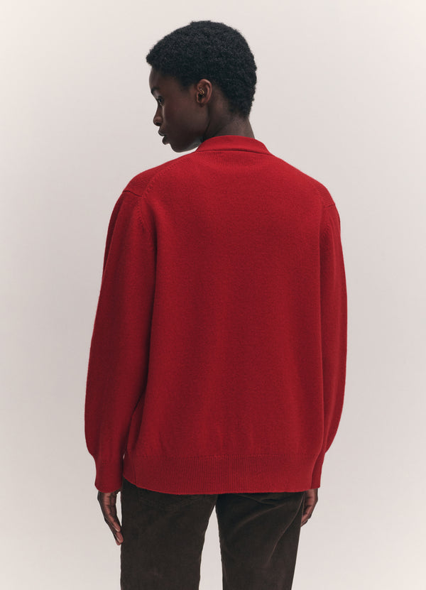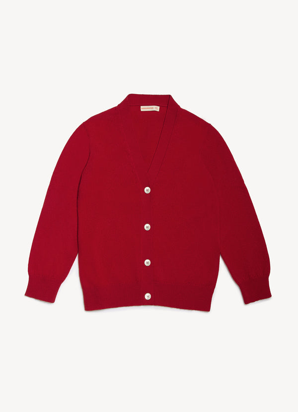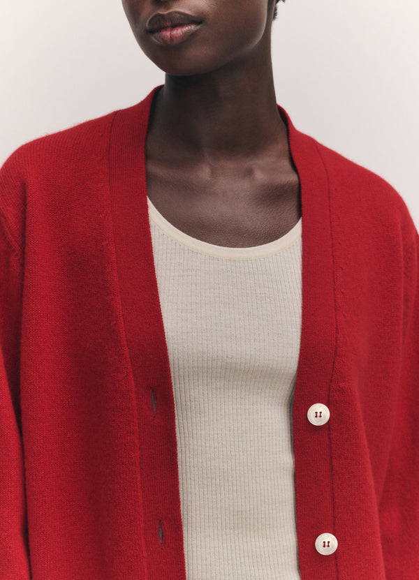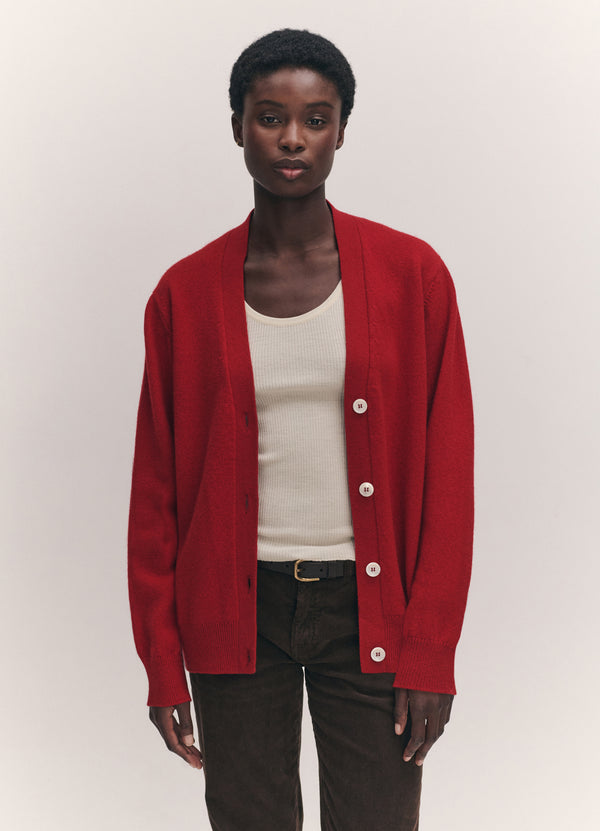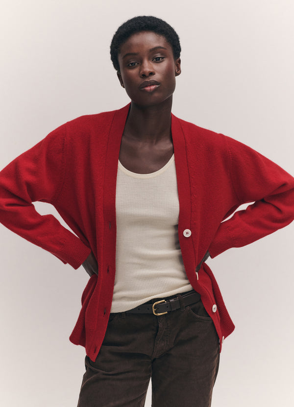 Introducing the Ava Cardigan in Ruby Red, knit in super soft, Scottish-spun Geelong lambswool. Its silhouette is neither slim, nor oversized, and has a subtle slouch for ease of layering with an elegant drape.