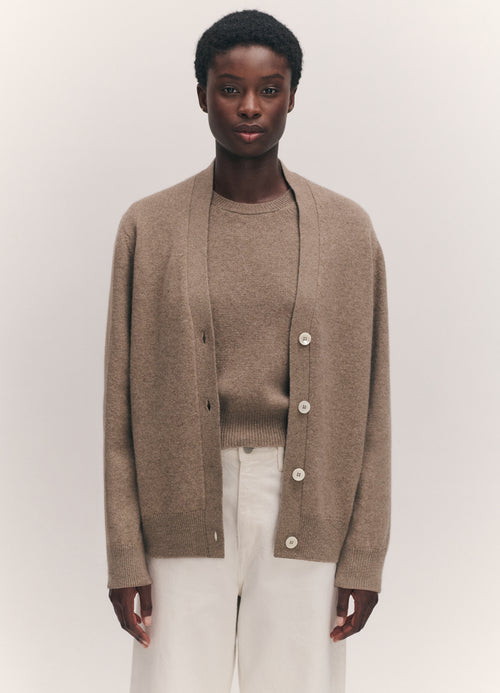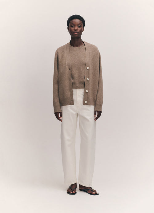Jacqui wears the Ava Cardigan in Dark Natural styled with the Sligo Crewneck in Dark Natural.