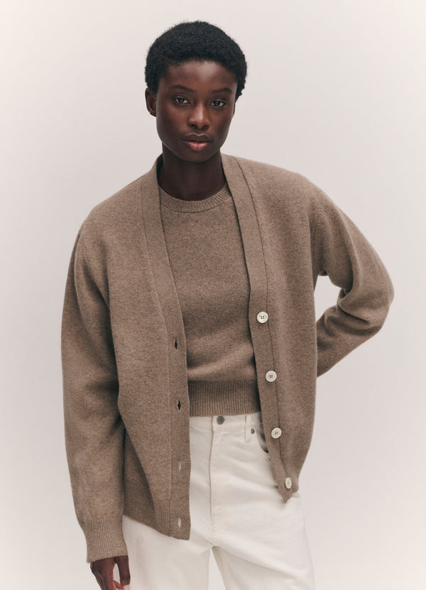 Introducing the Ava Cardigan in Dark Natural, knit in super soft, Scottish-spun Geelong lambswool. Its silhouette is neither slim, nor oversized, and has a subtle slouch for ease of layering with an elegant drape.