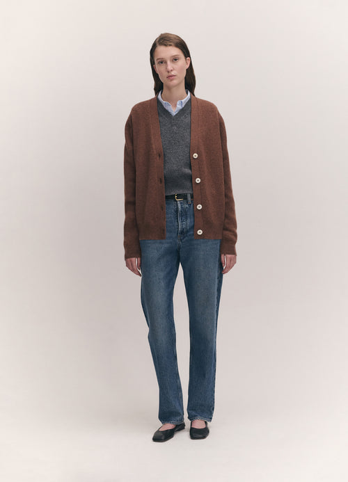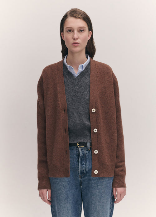 Introducing the Ava Cardigan in Hazelnut, knit in super soft, Scottish-spun Geelong lambswool. Its silhouette is neither slim, nor oversized, and has a subtle slouch for ease of layering with an elegant drape.