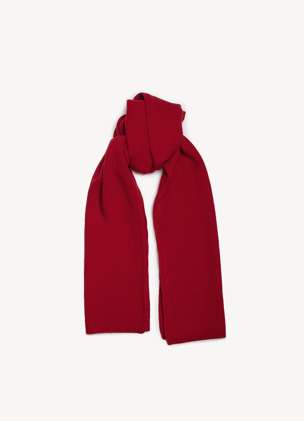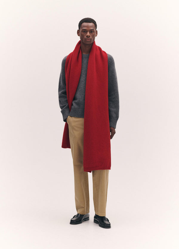 Godwin wears the Brea Blanket Scarf in Ruby Red styled with the Rosh Crewneck in Derby Grey.