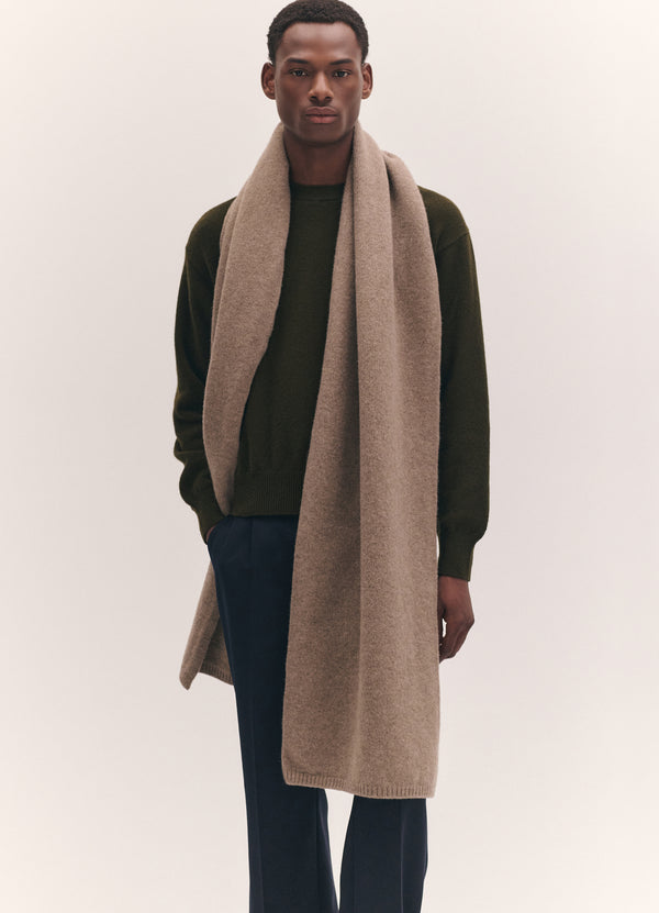 Godwin wears the Brea Blanket Scarf in Dark Natural styled with the Innes Slouch Crewneck in Military Green.