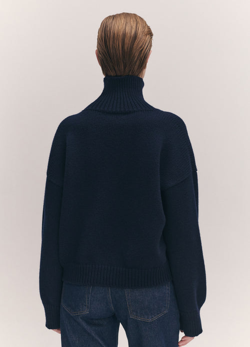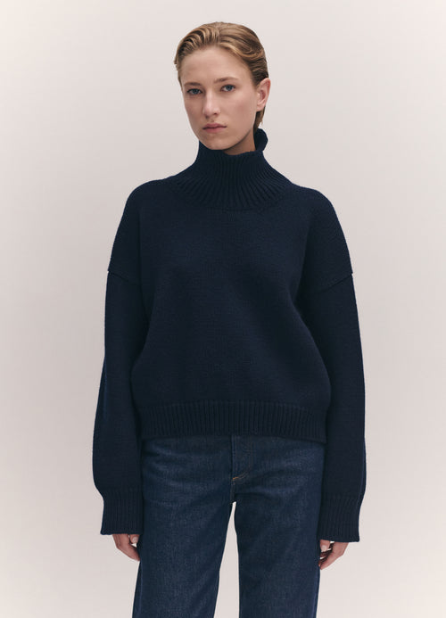 Knit in 100% Geelong Lambswool that is Responsible Wool Standard certified, proportions are slouchy through the body and sleeve with chunky collar and cuffs. Spun and made in the Borders of Scotland.