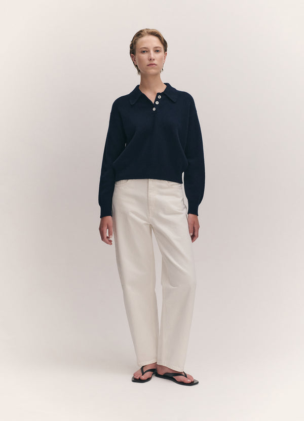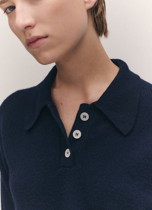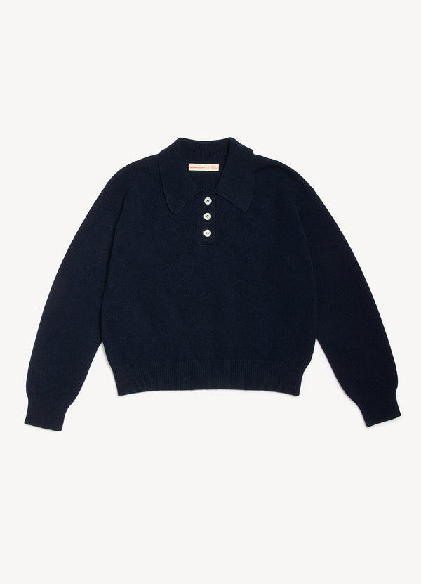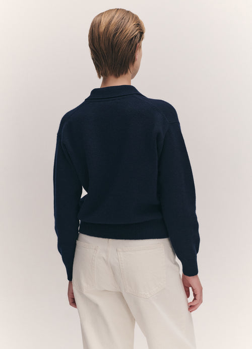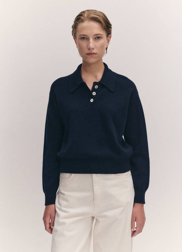 In soft Scottish-Spun Lambswool, Our Edie Polo Shirt is vintage sports-inspired, in Navy. Designed in a timelessly neat yet soft-silhouette with slightly dropped shoulders for subtle drape. Finished with Ribbed cuffs and collar and trocas shell buttons, finessed with thoughtful details.