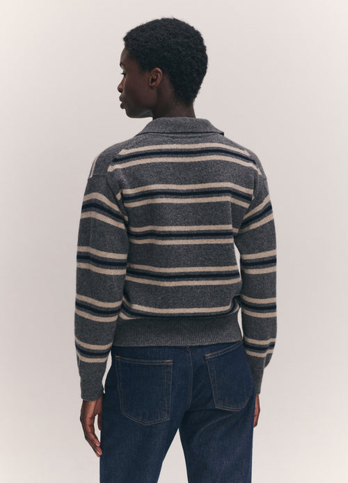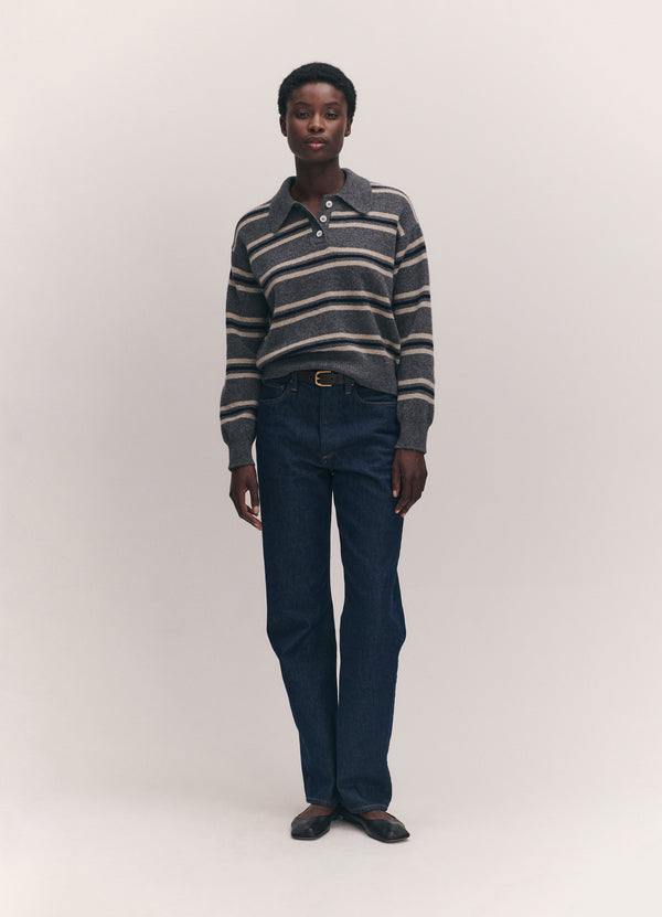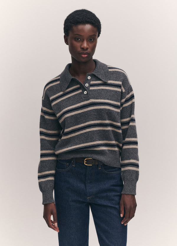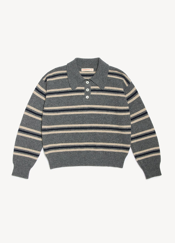The vintage-sports inspired Edie Stripe Polo Shirt in Grey Multi. Designed in a neat yet soft-silhouette with slightly dropped shoulders for subtle drape. Finished with ribbed cuffs and hem, a classic collar, and trocas shell buttons.