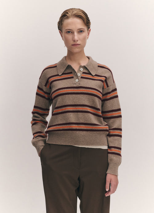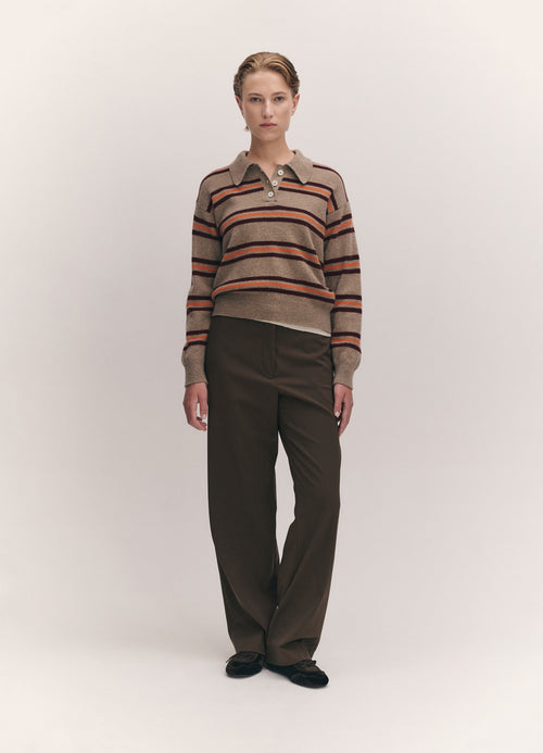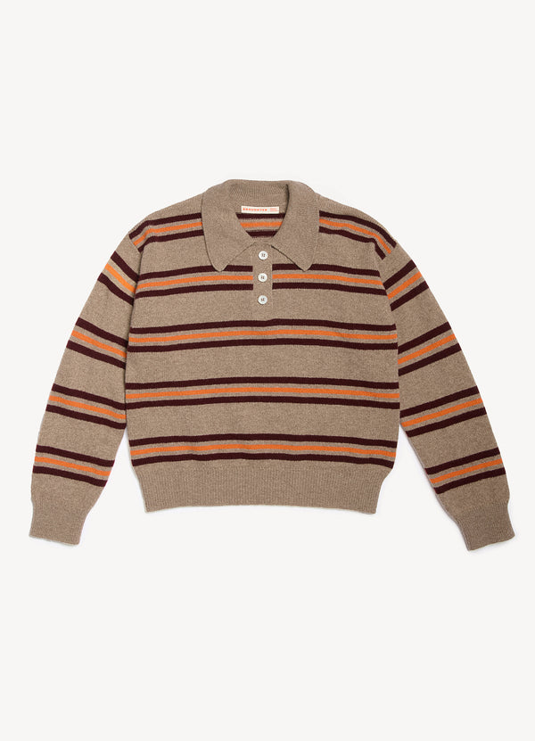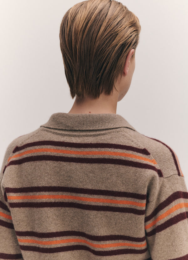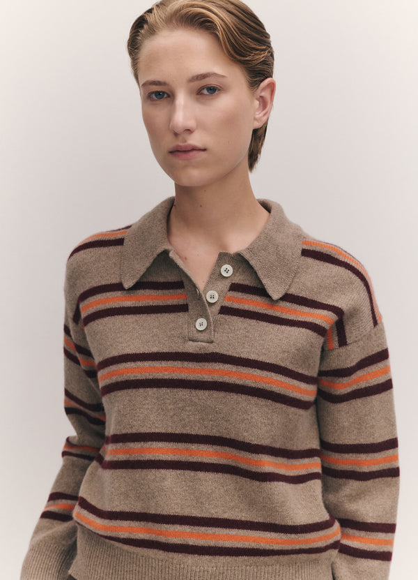 The vintage-sports inspired Edie Stripe Polo Shirt in Dark Natural. Designed in a neat yet soft-silhouette with slightly dropped shoulders for subtle drape. Finished with ribbed cuffs and hem, a classic collar, and trocas shell buttons.