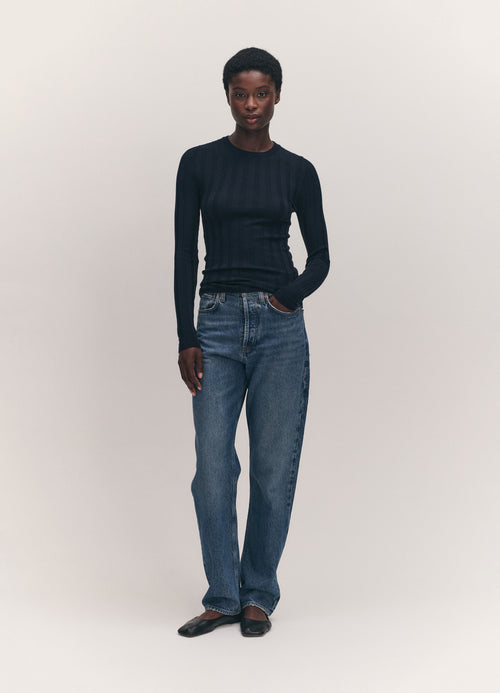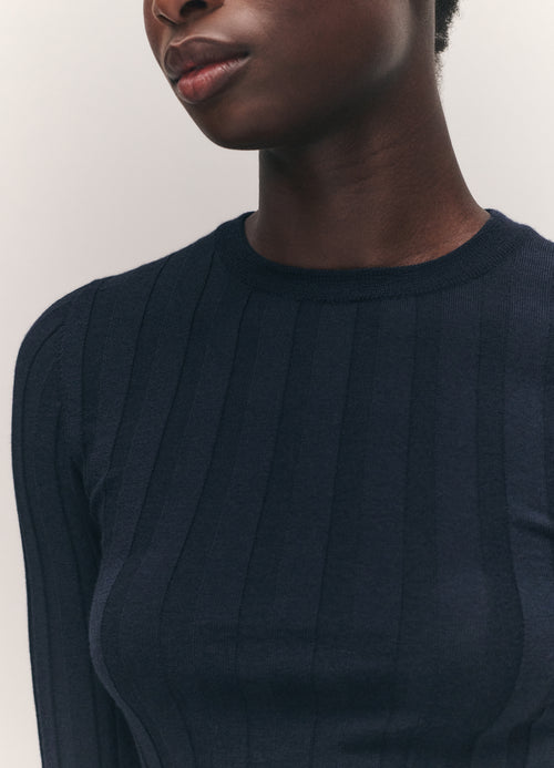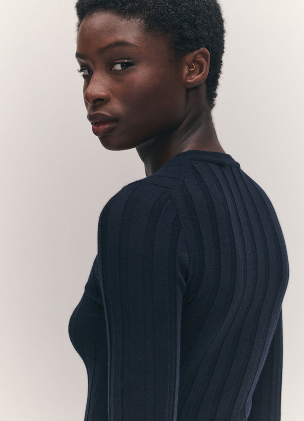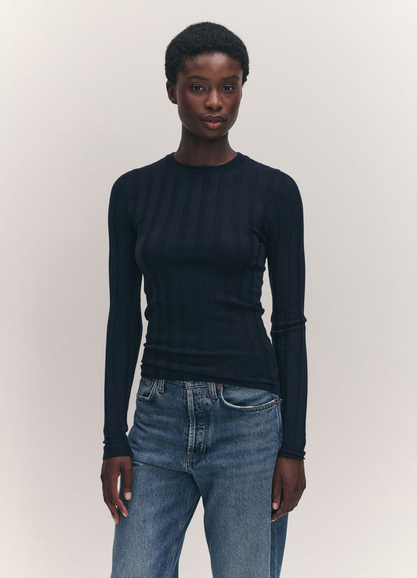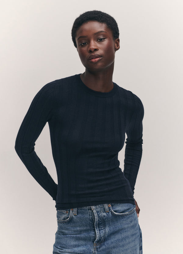 The Arklow Extrafine Merino Ribbed Crewneck. A ribbed crew made from extra-fine merino wool. Hand crafted in Scotland, with a finer micron count than cashmere, making it incredibly soft to the touch but with the warmth and wear of the finest wool. In a slim-fit silhouette with classic crewneck, a wardrobe staple.