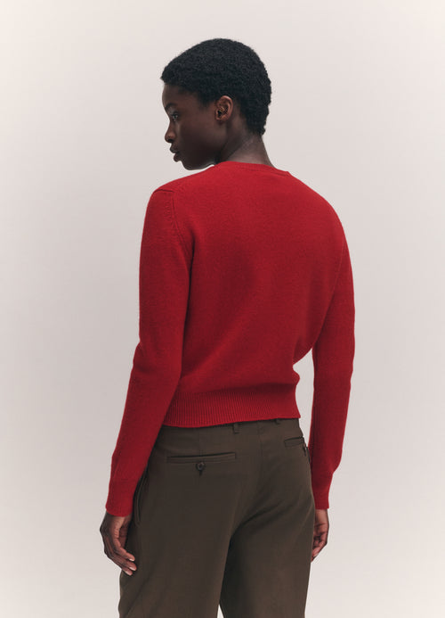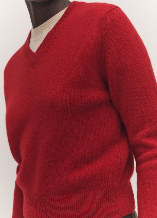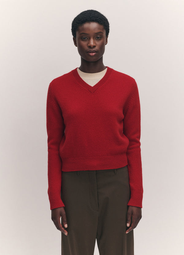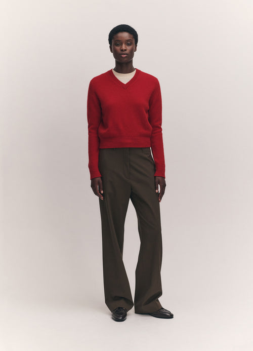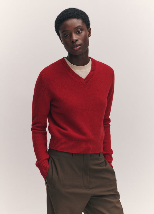 Jacqui wears the Sligo Shrunken V-Neck in Ruby Red styled with the Emer Cashmere T-Shirt in Canvas.