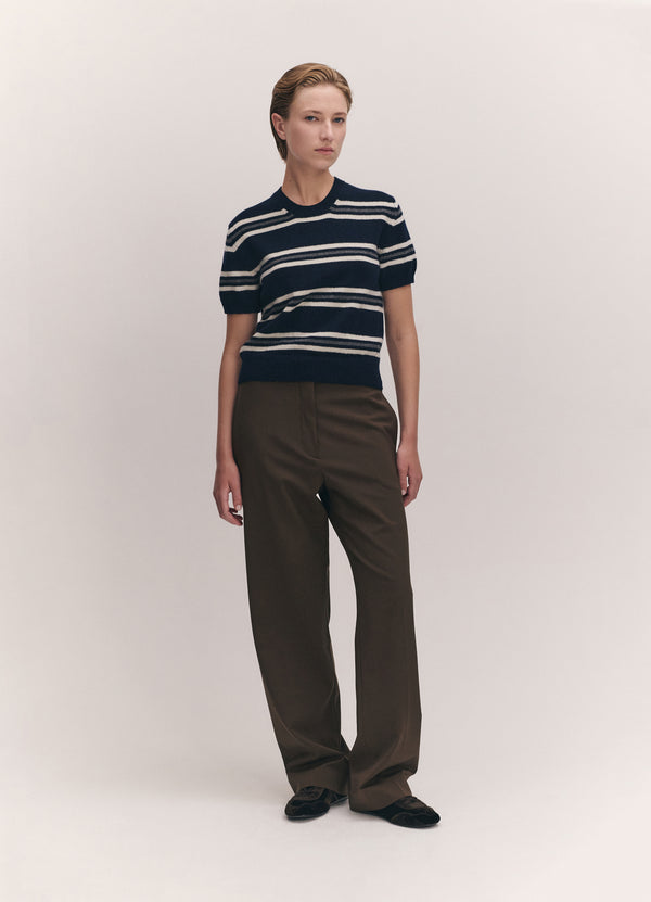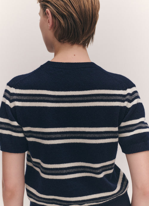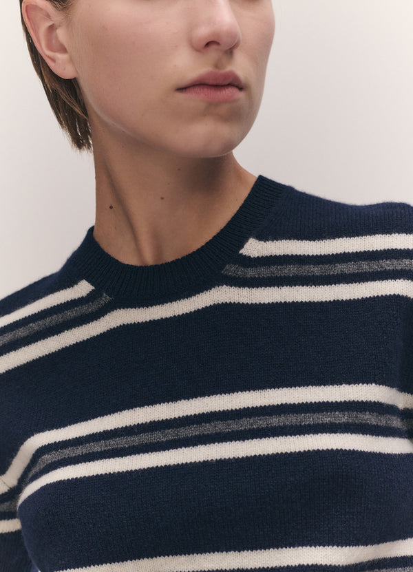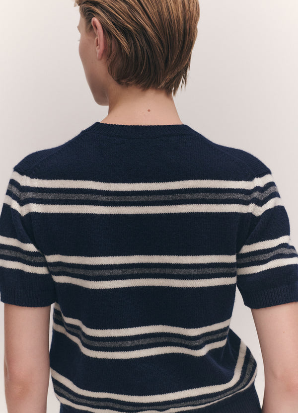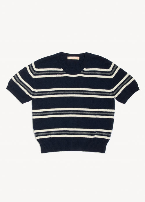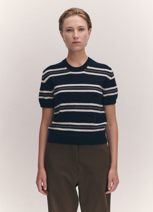 In the softest, Scottish-spun Geelong Lambswool, our Wicklow Stripe T-Shirt in Navy has a subtly slouchy silhouette, sitting just above the waist, with gently voluminous short sleeves. A piece which pairs effortlessly, layered or worn on its own.
