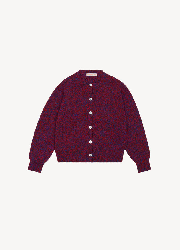 The Ada Mouline Crewneck Cardigan in softest, Scottish-spun Mouline geelong lambswool. Inspired by the old school classicism of a crewneck cardigan but with a gently modern sensibility, proportions are softened and subtly slouchy to create a relaxed silhouette. Mouline is a slightly heavier twisted yarn made up, in this style, of three shades, poppy red, port and klein blue, creating a soft speckled appearance.