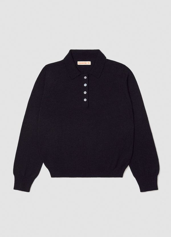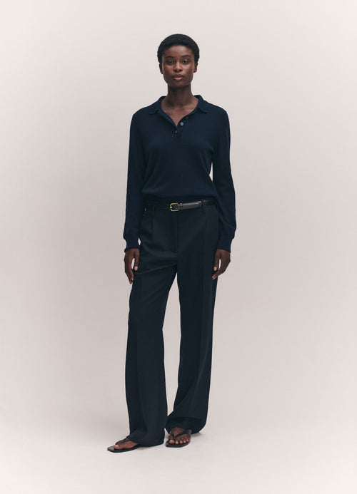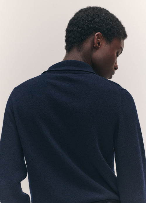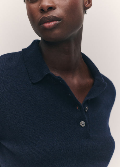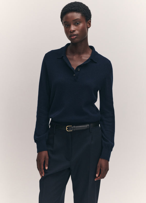 The Aoife Cashmere Polo Shirt. Crafted in Scotland from fine-spun, lightweight cashmere, in Dark Navy. Part of our Underpinnings collection: a foundational shape designed to be worn on its own or as an effortless transitional piece, easily layered.