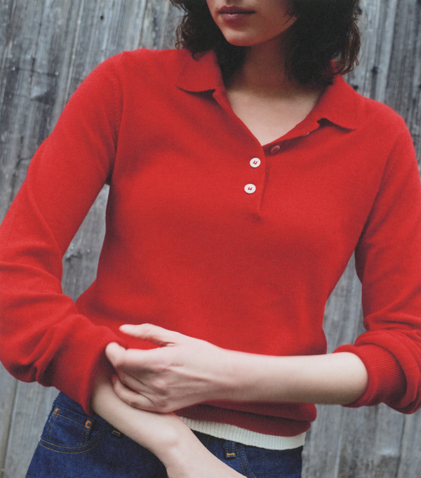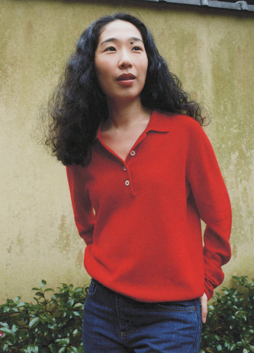 The Aoife Cashmere Polo Shirt. Crafted in Scotland from fine-spun, lightweight cashmere, in Poppy Red. Part of our Underpinnings collection: a foundational shape designed to be worn on its own or as an effortless transitional piece, easily layered.