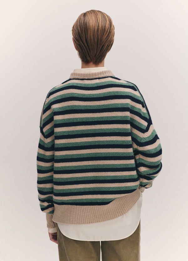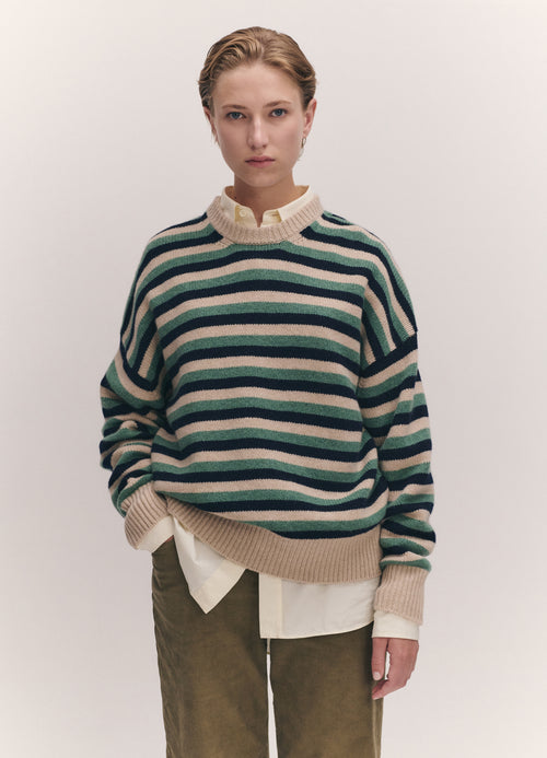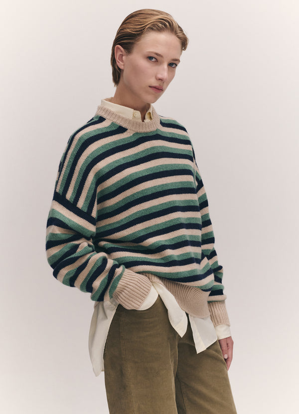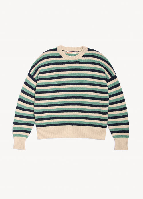 The Balla Crewneck is crafted in a chunky 5-gauge weight for a beautifully soft hand-feel and tactile warmth. Subtly draped and gently oversized for a relaxed fit, in this seasons Strath, Navy and Oatmeal Stripe.