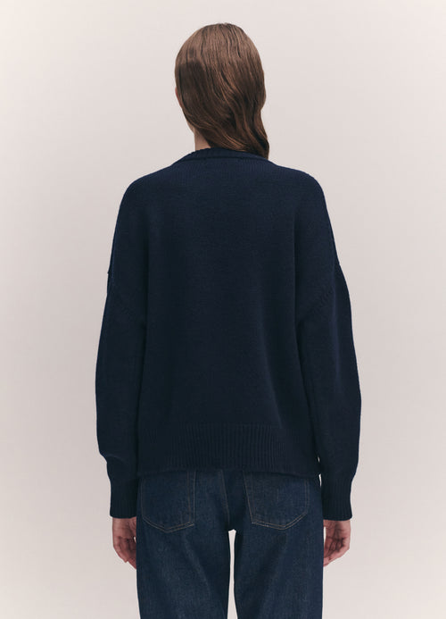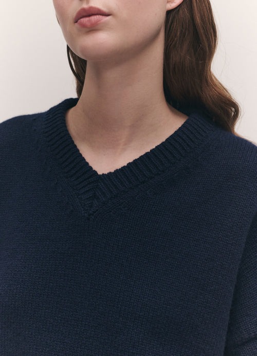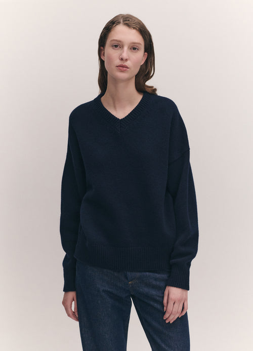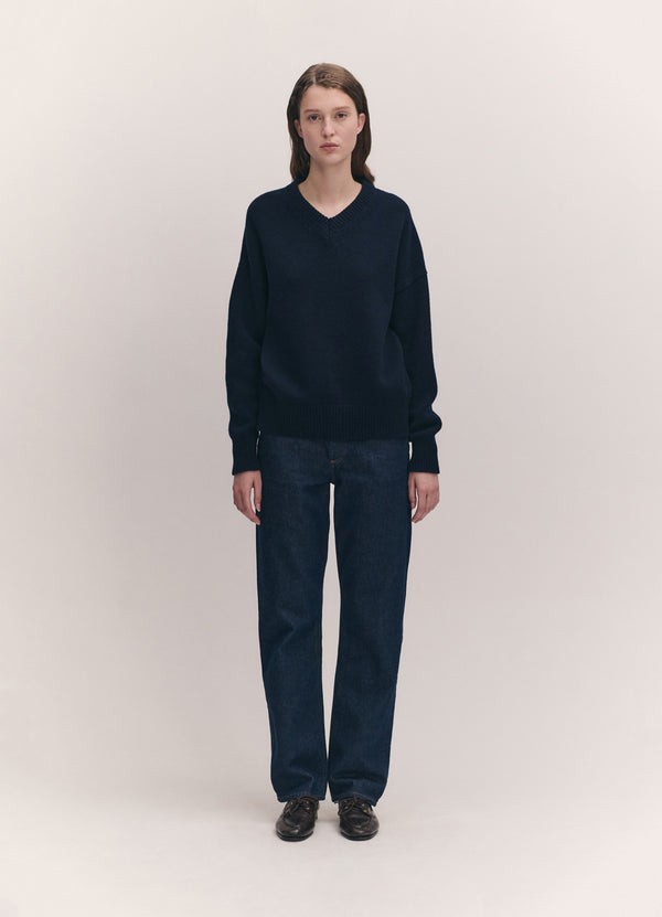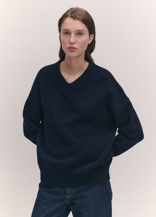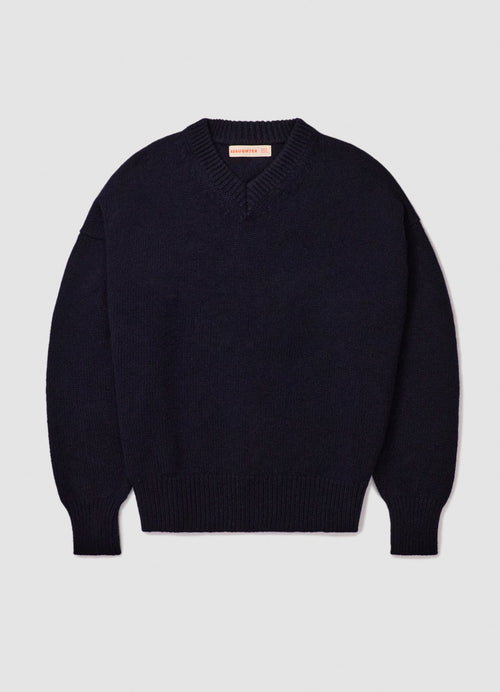 The soft elegance of a boyish v-neck collar. The Balla V is crafted in a chunky 5-gauge weight for a beautifully soft hand-feel and tactile warmth. Subtly draped and gently oversized.