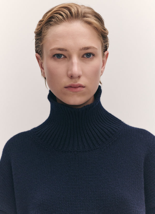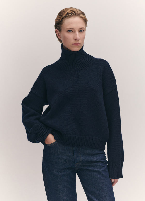 Knit in 100% Geelong Lambswool that is Responsible Wool Standard certified, proportions are slouchy through the body and sleeve with chunky collar and cuffs. Spun and made in the Borders of Scotland.