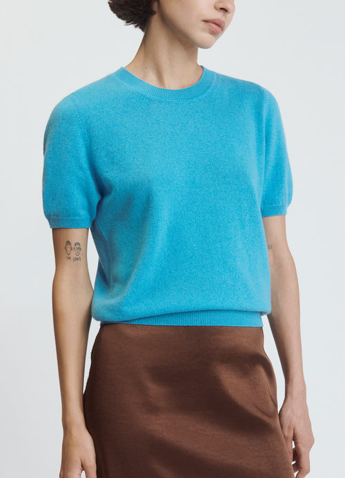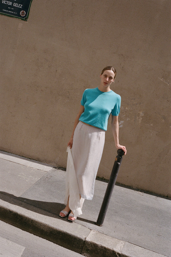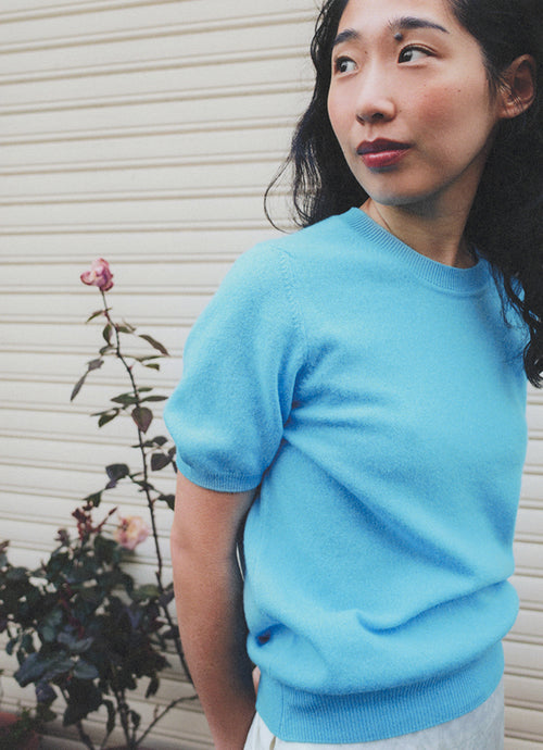 The Emer Cashmere T-Shirt, crafted in Scotland from fine-spun, lightweight cashmere. Part of our Underpinnings collection, the Emer is a foundational shape designed to be worn on its own or as an effortless transitional piece, easily layered.