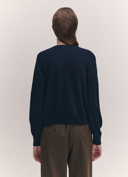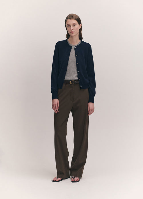 Stinne wears the Enya Cashmere Cardigan in Dark Navy styled with the Emer Cashmere T-Shirt in Soft Grey.