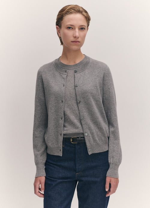 Mees wears the Enya Cashmere Cardigan in Soft Grey styled with the Emer Cashmere T-Shirt in Soft Grey.