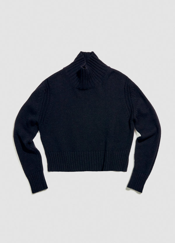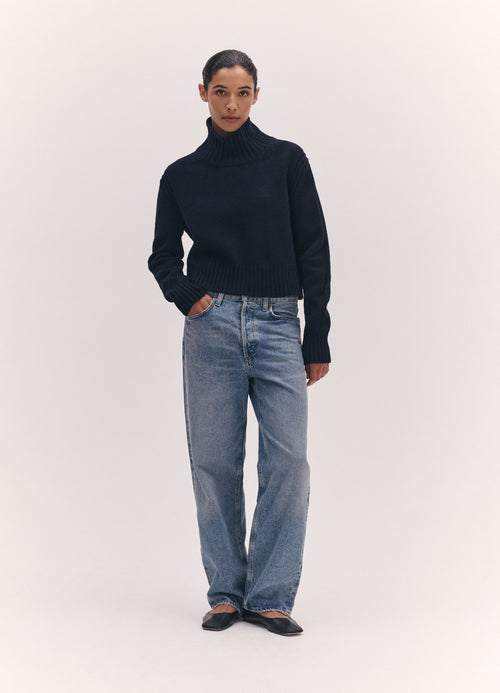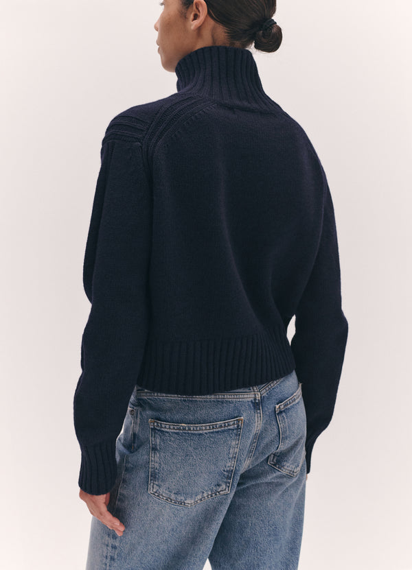 Our Fintra Knit in soft and warm 4-ply navy lambswool is a timeless piece. Designed with a waist-skimming length, proportions are neat with a long sleeve, dropped shoulder, and jaw-grazing chunky ribbed collar. Finished with signature rib detailing at shoulder and sleeve. Knit in pure, Yorkshire-spun lambswool.