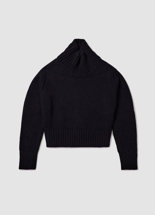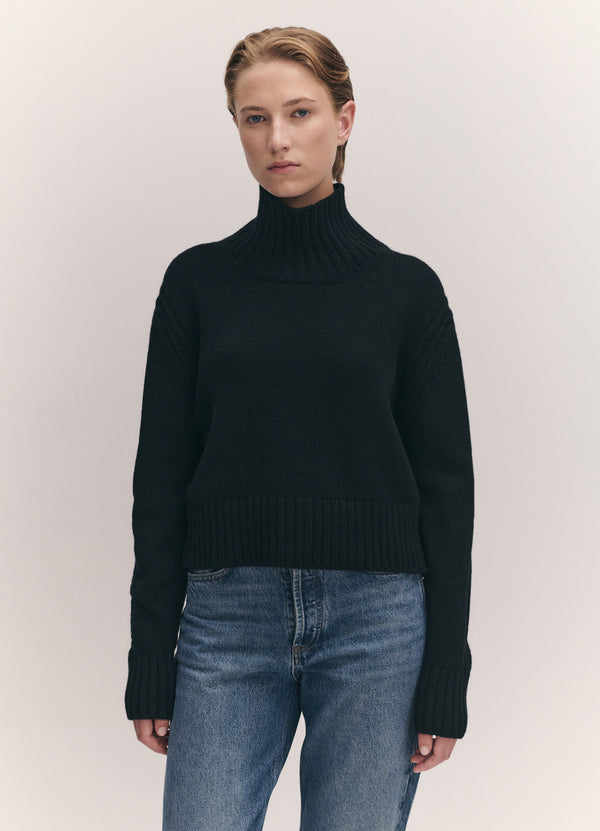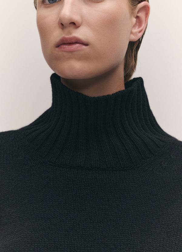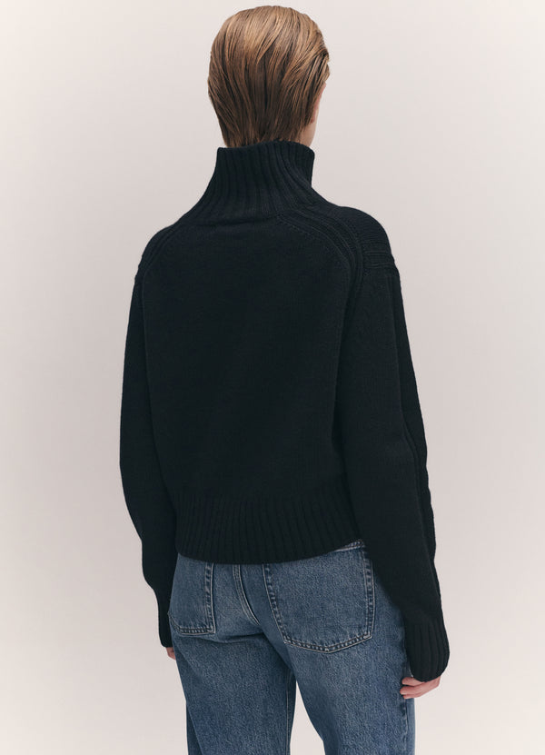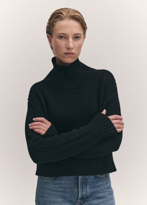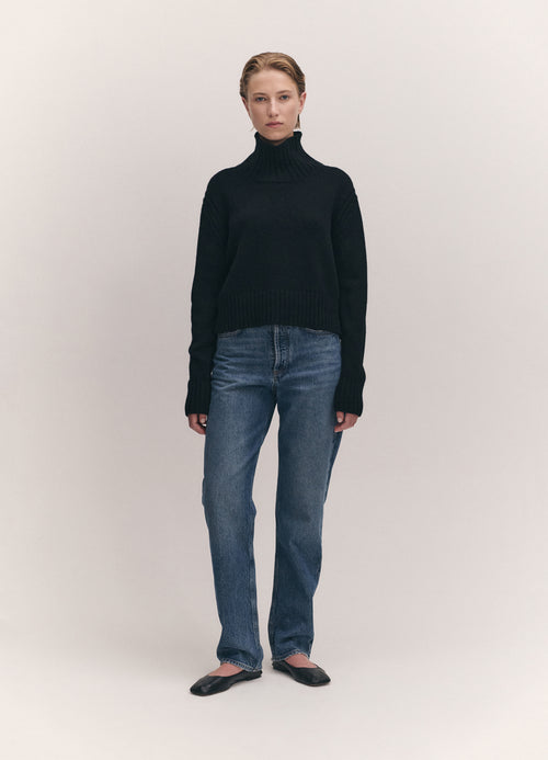 Our Fintra Knit in soft and warm 4-ply navy lambswool is a timeless piece. Designed with a waist-skimming length, proportions are neat with a long sleeve, dropped shoulder, and jaw-grazing chunky ribbed collar. Finished with signature rib detailing at shoulder and sleeve. Knit in pure, Yorkshire-spun lambswool.
