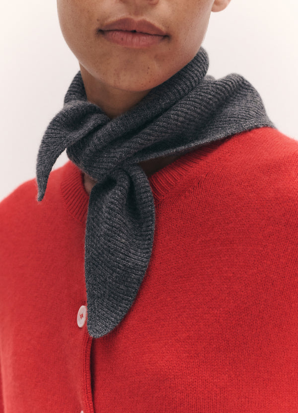 Maya wears the Fionn Cashmere Foulard in Derby Grey styled with the Ada Crewneck Cardigan in Poppy Red.