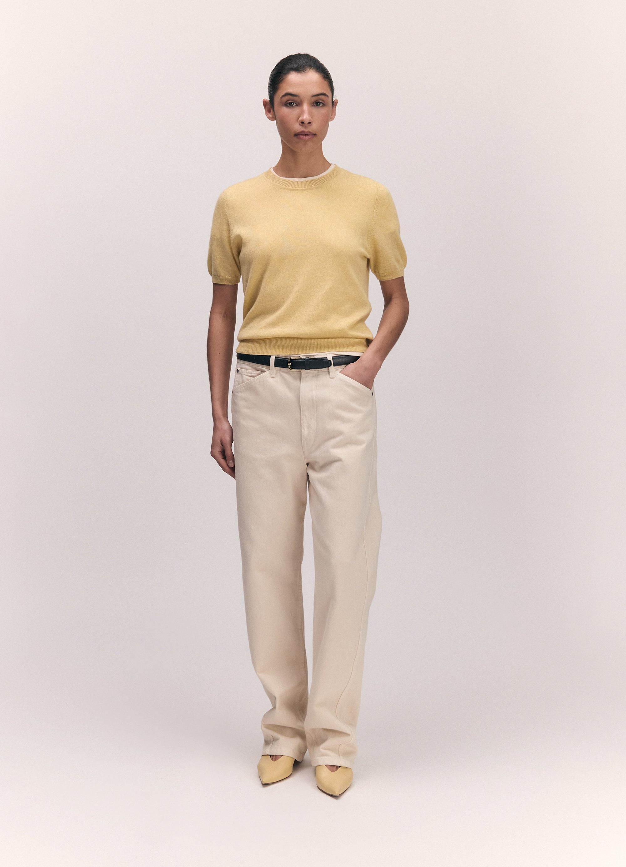 The Emer Cashmere T-Shirt, crafted in Scotland from fine-spun, lightweight cashmere. Part of our Underpinnings collection, the Emer is a foundational shape designed to be worn on its own or as an effortless transitional piece, easily layered.