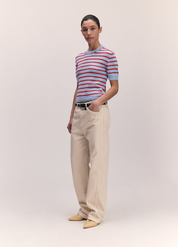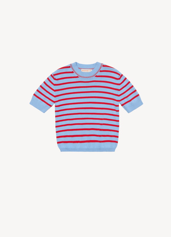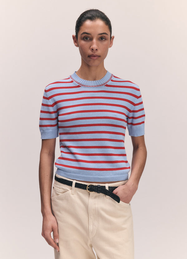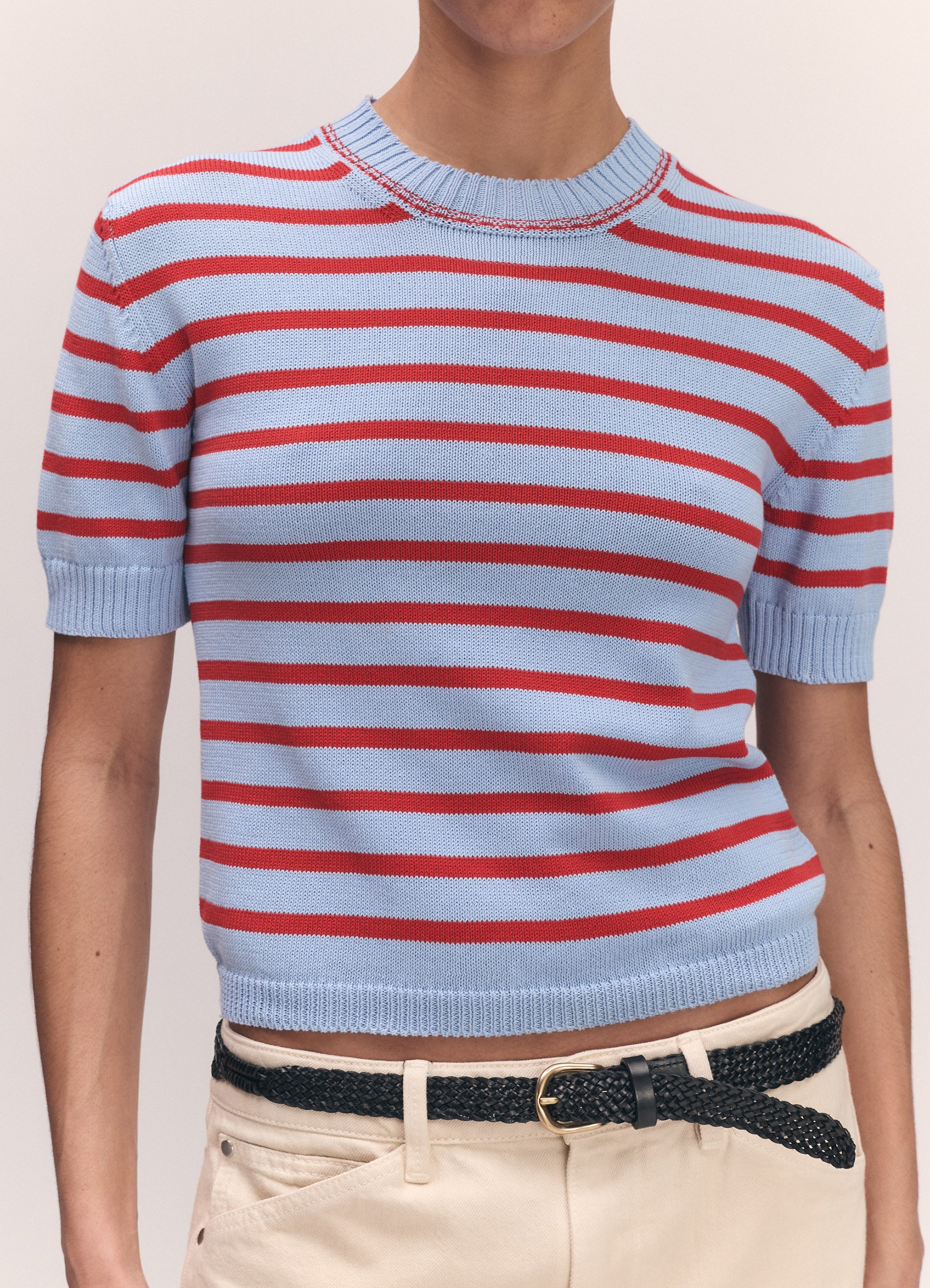 Knitted in a fine 12-gauge cotton, the silhouette is lightweight and breathable with a relaxed, easy fit. Finished with a clean crew neckline, neat ribbed trims and crisp stripe detailing, it’s a versatile piece designed for warmer days and effortless layering.