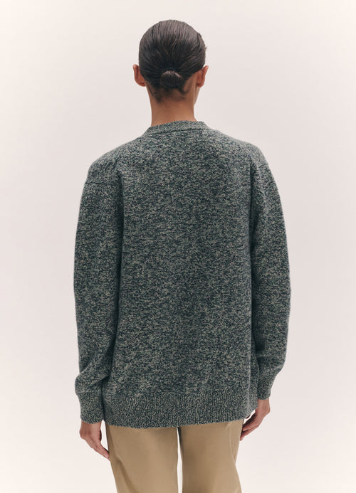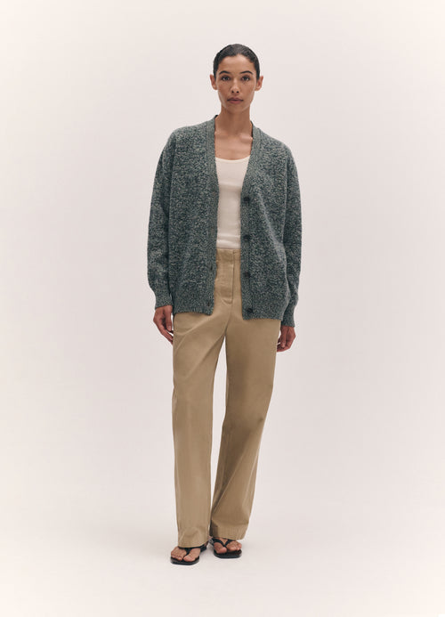 Introducing the Ava Cardigan in Mouline, knit in super soft, Scottish-spun Geelong lambswool. Mouline is a twisted yarn made up, in this style, of three shades, navy, oatmeal & strath green, creating a soft speckled appearance. Its silhouette is neither slim, nor oversized, and has a subtle slouch for ease of layering with an elegant drape.