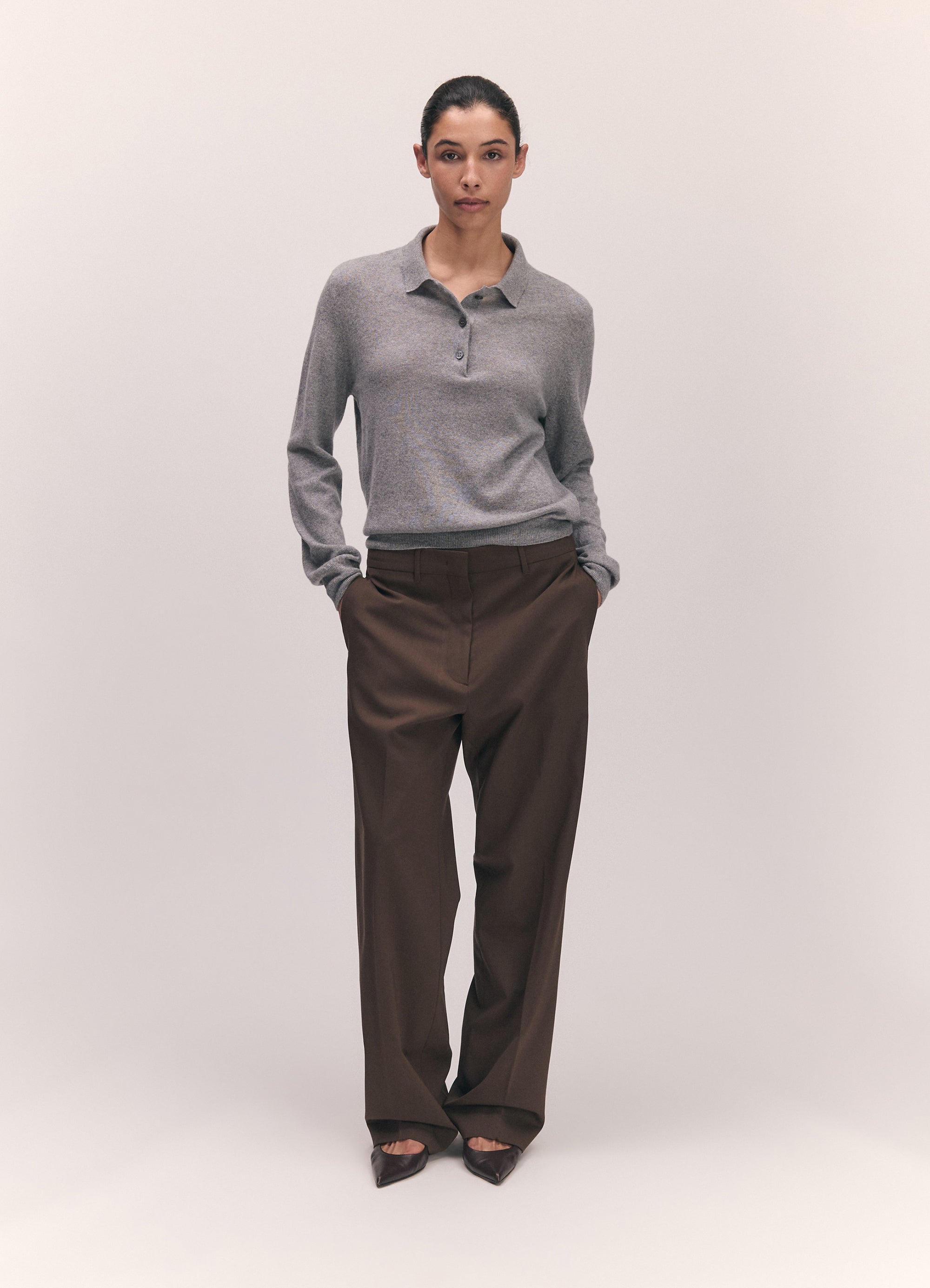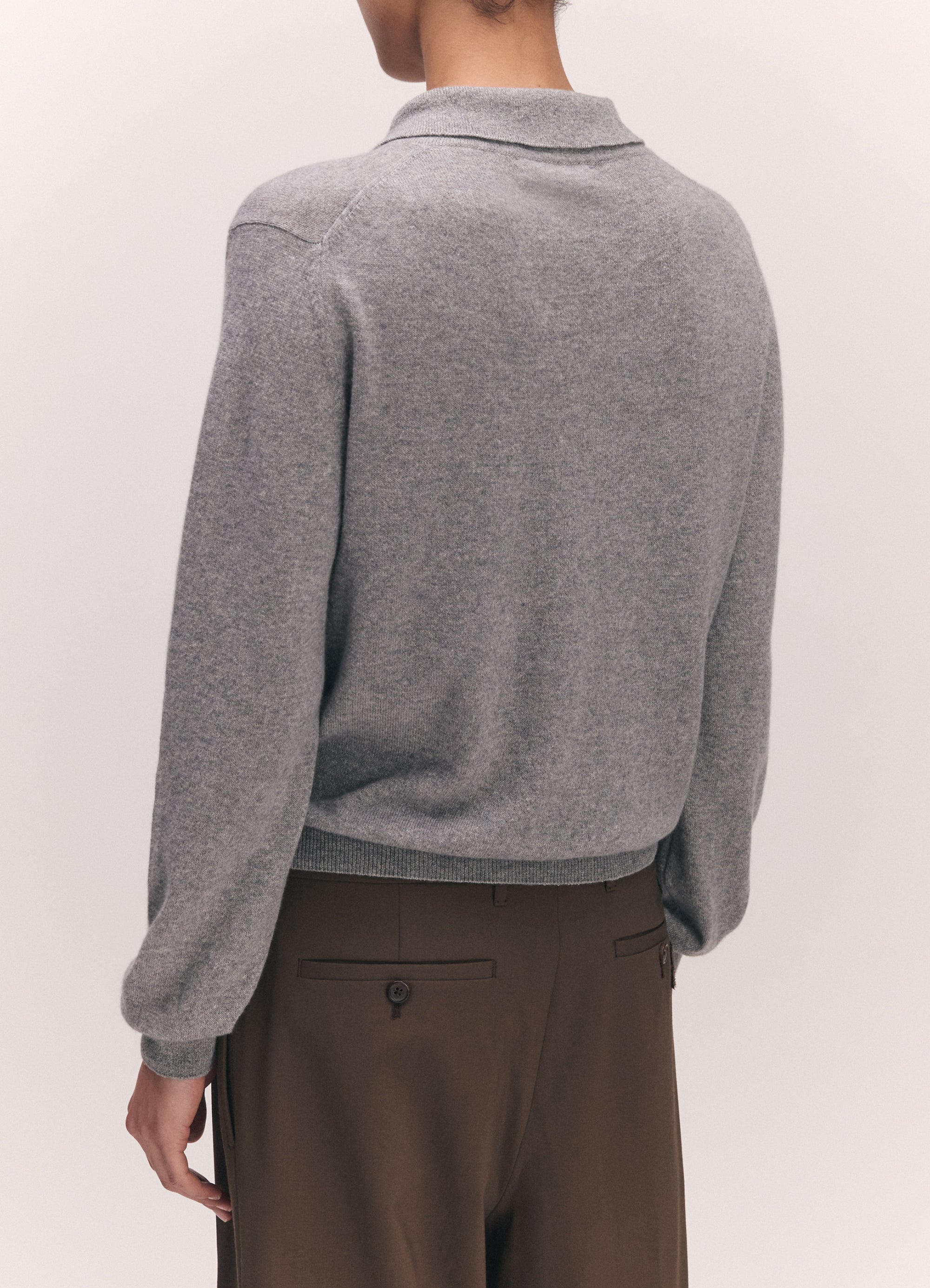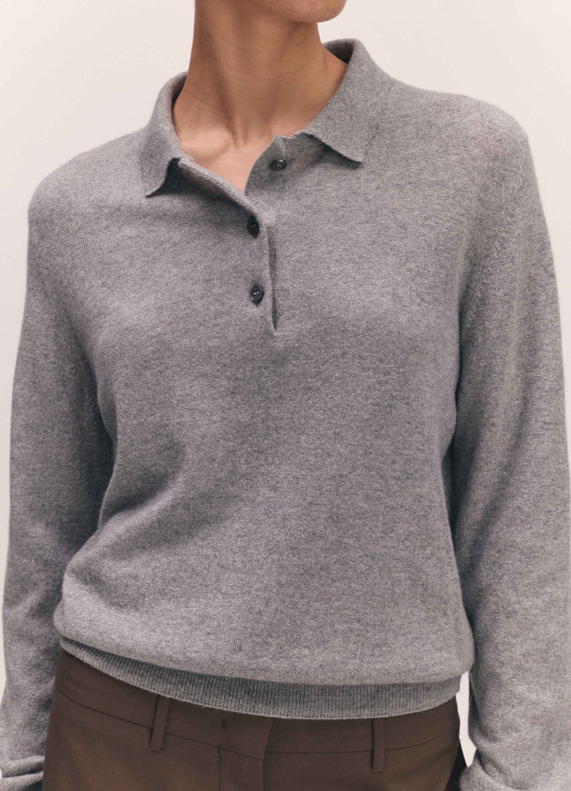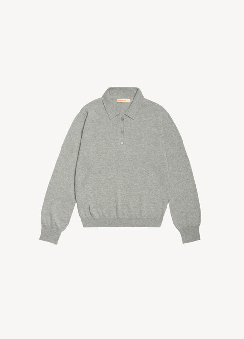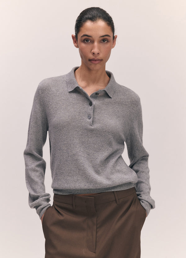 The Aoife Cashmere Polo Shirt. Crafted in Scotland from fine-spun, lightweight cashmere, in a soft grey. Part of our Underpinnings collection: a foundational shape designed to be worn on its own or as an effortless transitional piece, easily layered.